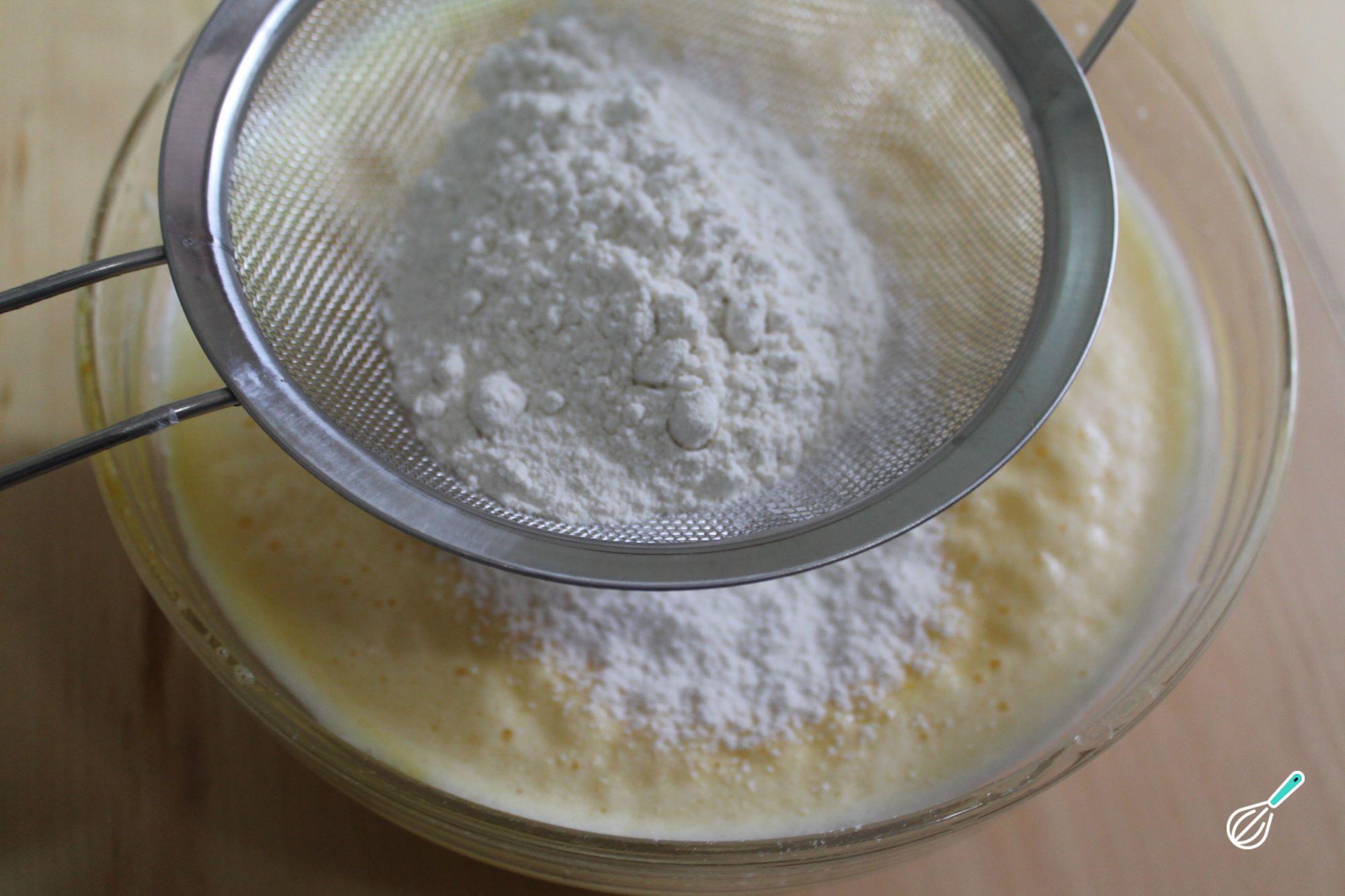 Peneire a farinha com uma pitada de sal e mexa bem com um batedor manual, fazendo movimentos circulares para não reduzir a textura aerada do bolo.