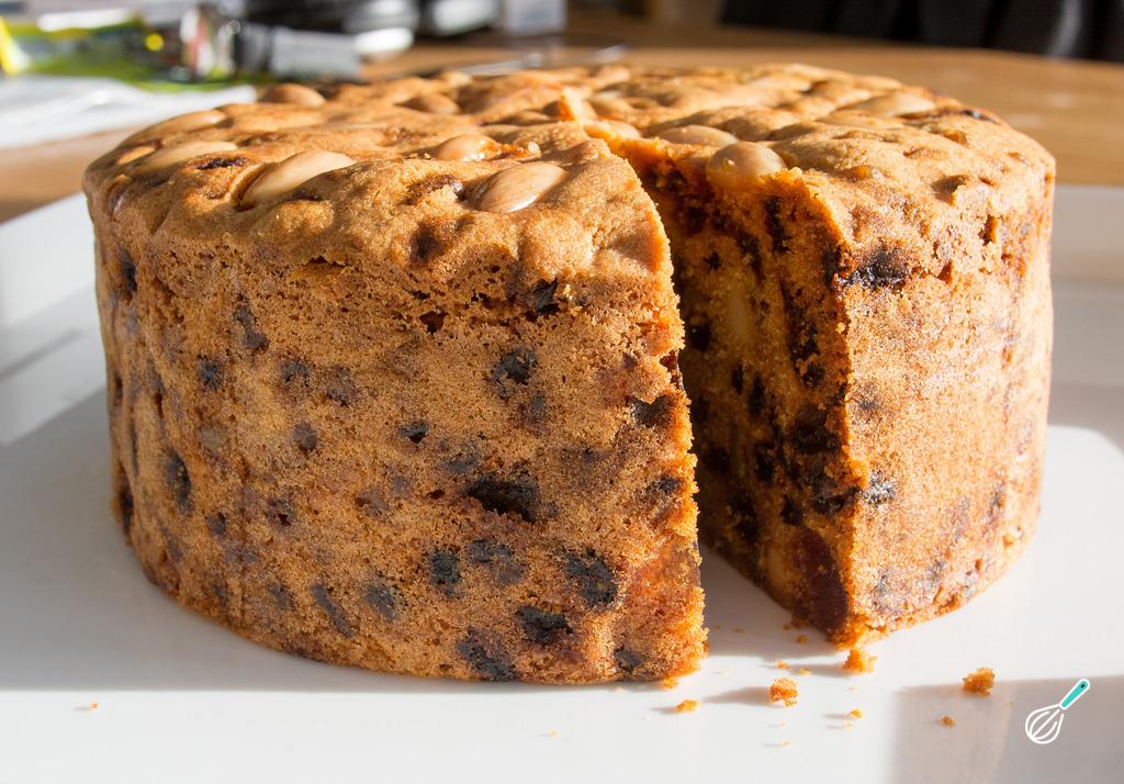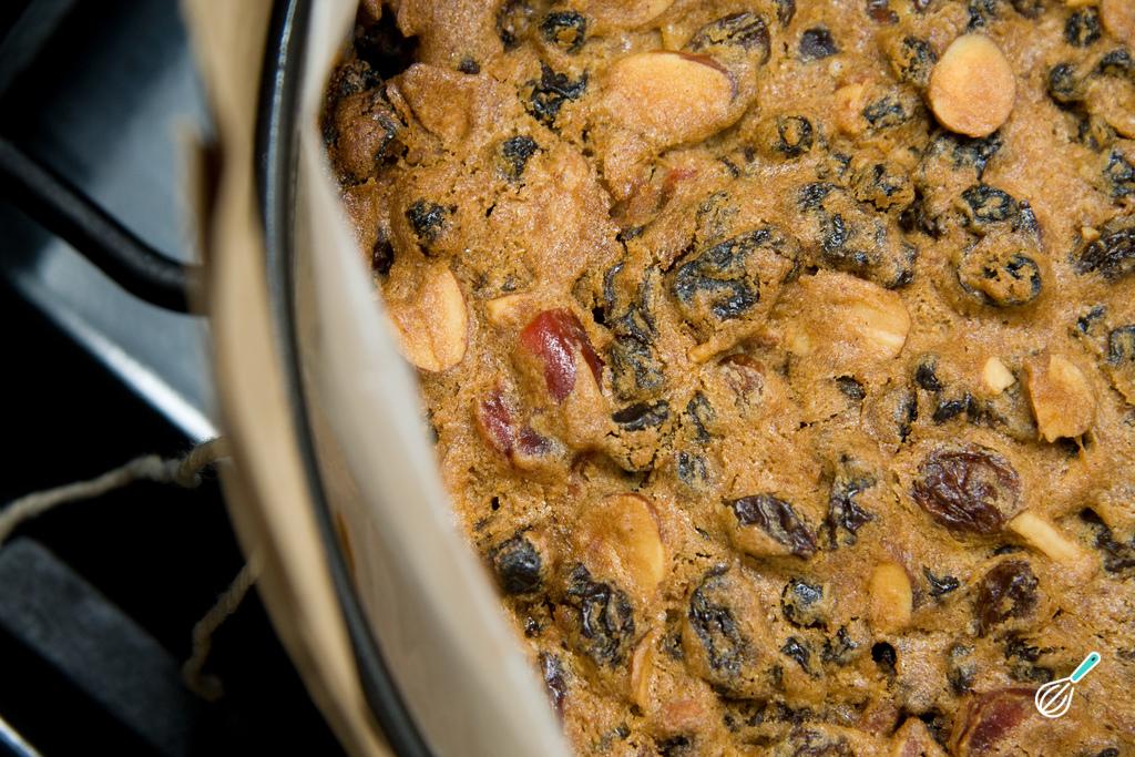 Asse o bolo no forno aquecido a 150ºC durante 2 horas. Ao fim desse tempo faça o teste do palito e, se ainda não estiver pronto, deixe ficar por mais 10 minutos. Retire e espere esfriar um pouco para desenformar. Depois fure com um garfo e regue com 2-4 colheres de sopa do rum ou whisky usado na receita, para que fique úmido.