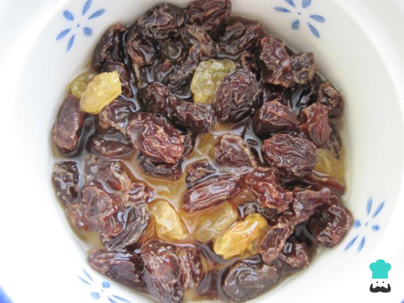 Antes de começar preparando esta receita de bolo de Natal com frutas desidratadas coloque as uvas-passa e as ameixas hidratando numa tigela com o conhaque por, no mínimo, 1 hora, mexendo de vez em quando.