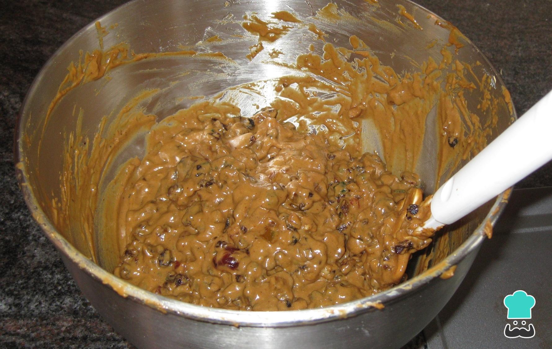 O passo seguinte deste bolo de Natal aromático é acrescentar os ingredientes secos do passo nº2 à mistura anterior e mexer bem. Em seguida adicione também as frutas hidratadas junto com o conhaque e as nozes, e envolva tudo.
