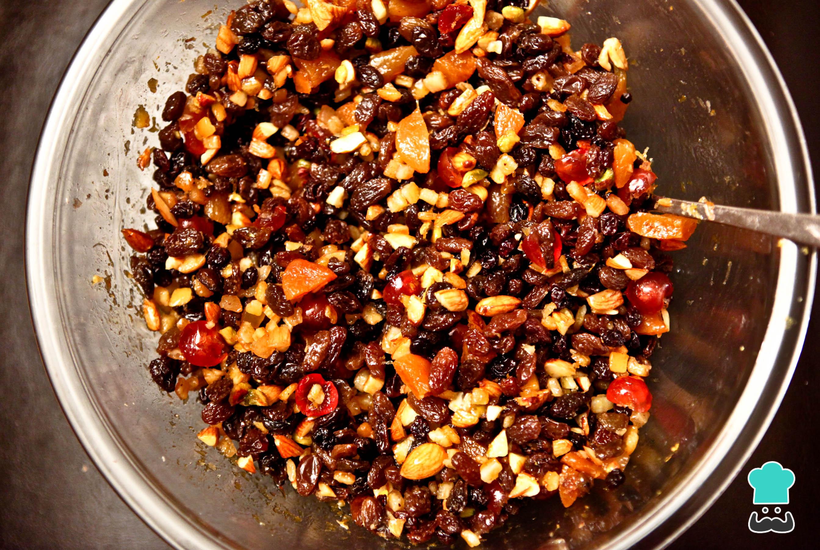 O primeiro passo do preparo deste bolo natalino da Palmirinha é colocar as frutas secas hidratando no vinho do Porto, para que tomem o sabor e fiquem macias. Deixe repousar por, no mínimo, 1 hora.