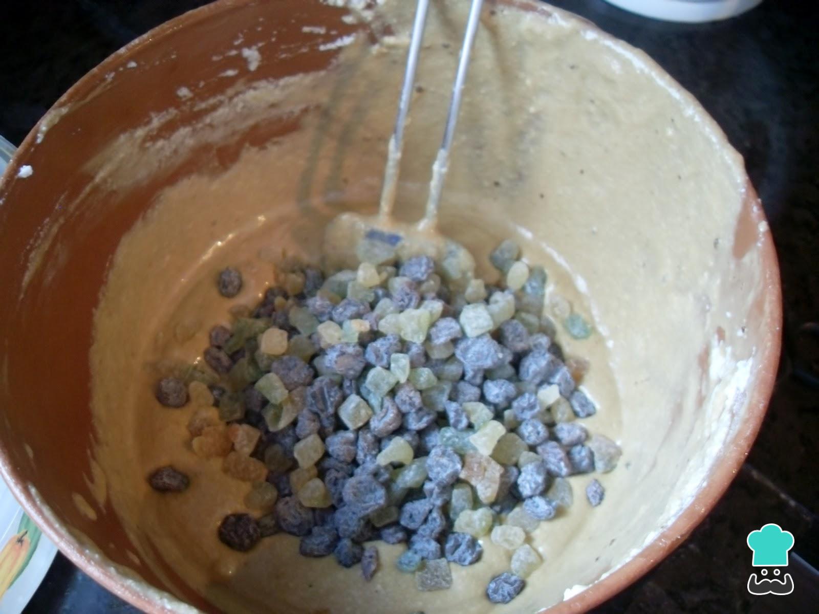 Reserve 4 colheres de sopa de farinha e acrescente a restante aos ingredientes anteriores, envolvendo bem. A farinha reservada você mistura com os frutos secos que estiveram hidratando, para evitar que eles desçam na massa deste bolo de Natal quando ele estiver assando.