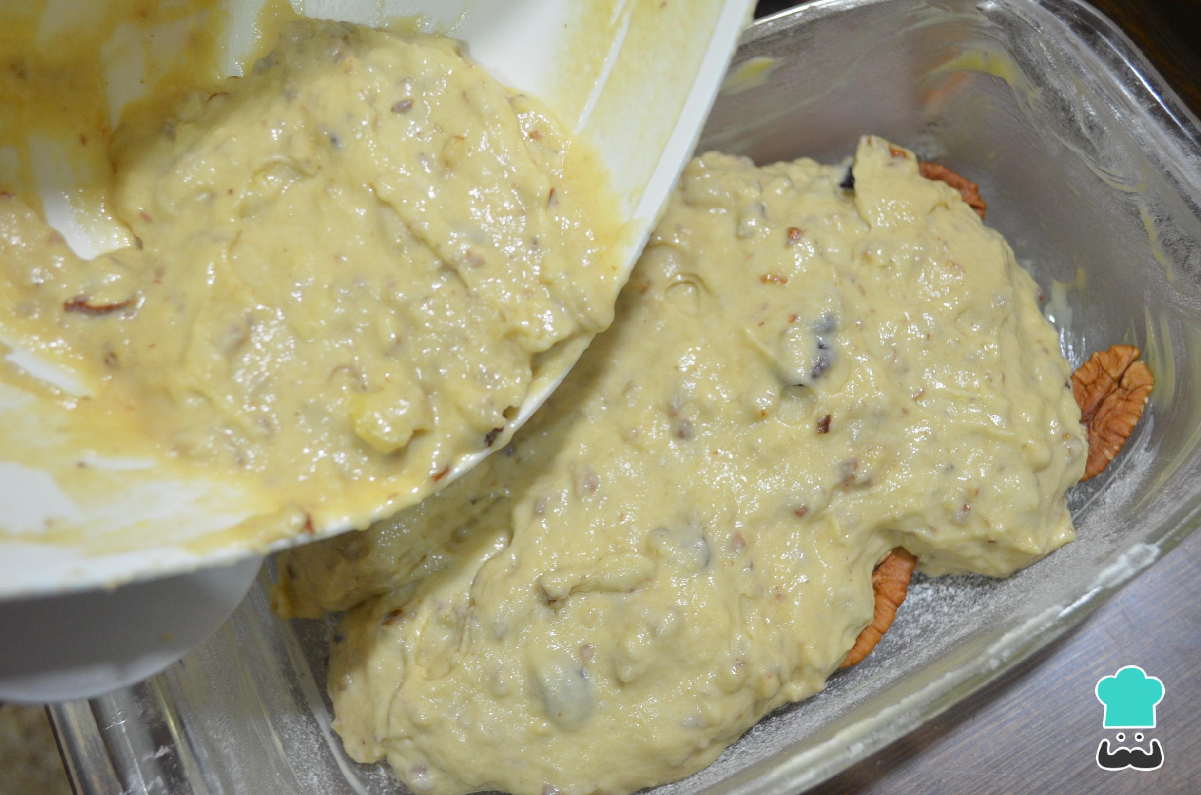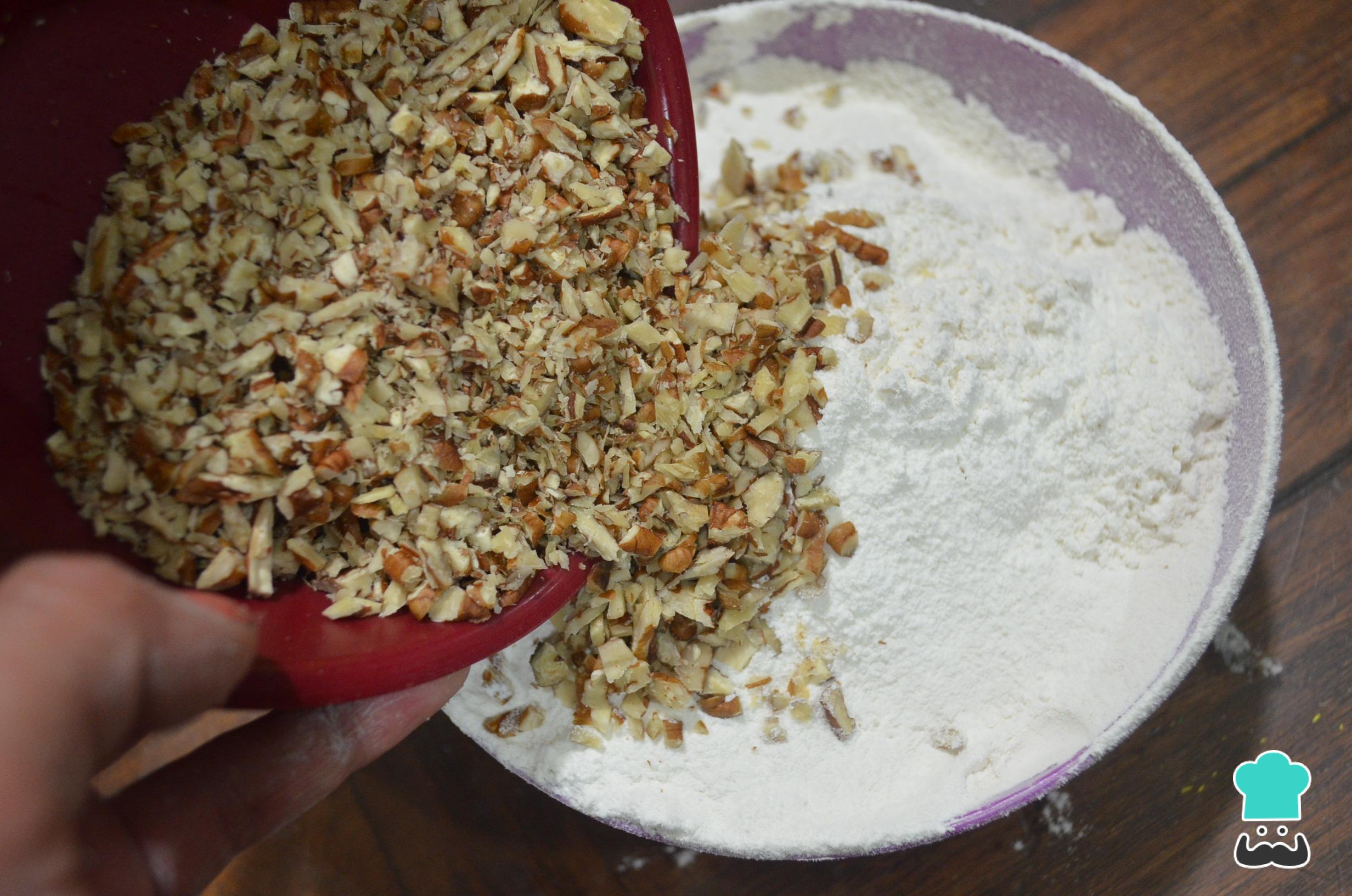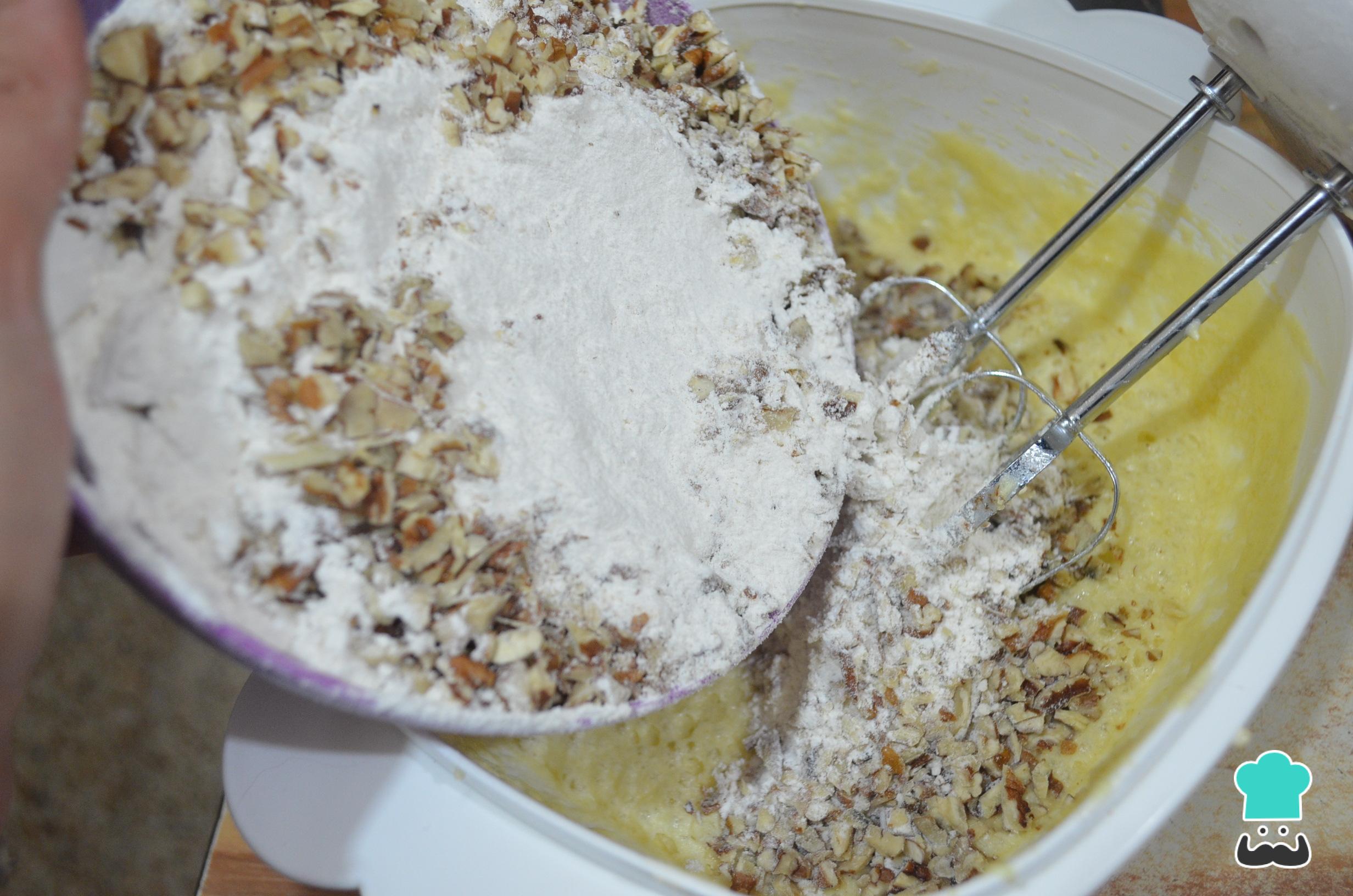 Por fim, adicione os ingredientes secos reservados e misture muito bem, sem bater. Quando todos os ingredientes deste bolo de nozes estiverem bem incorporados, coloque o fermento e misture levemente.