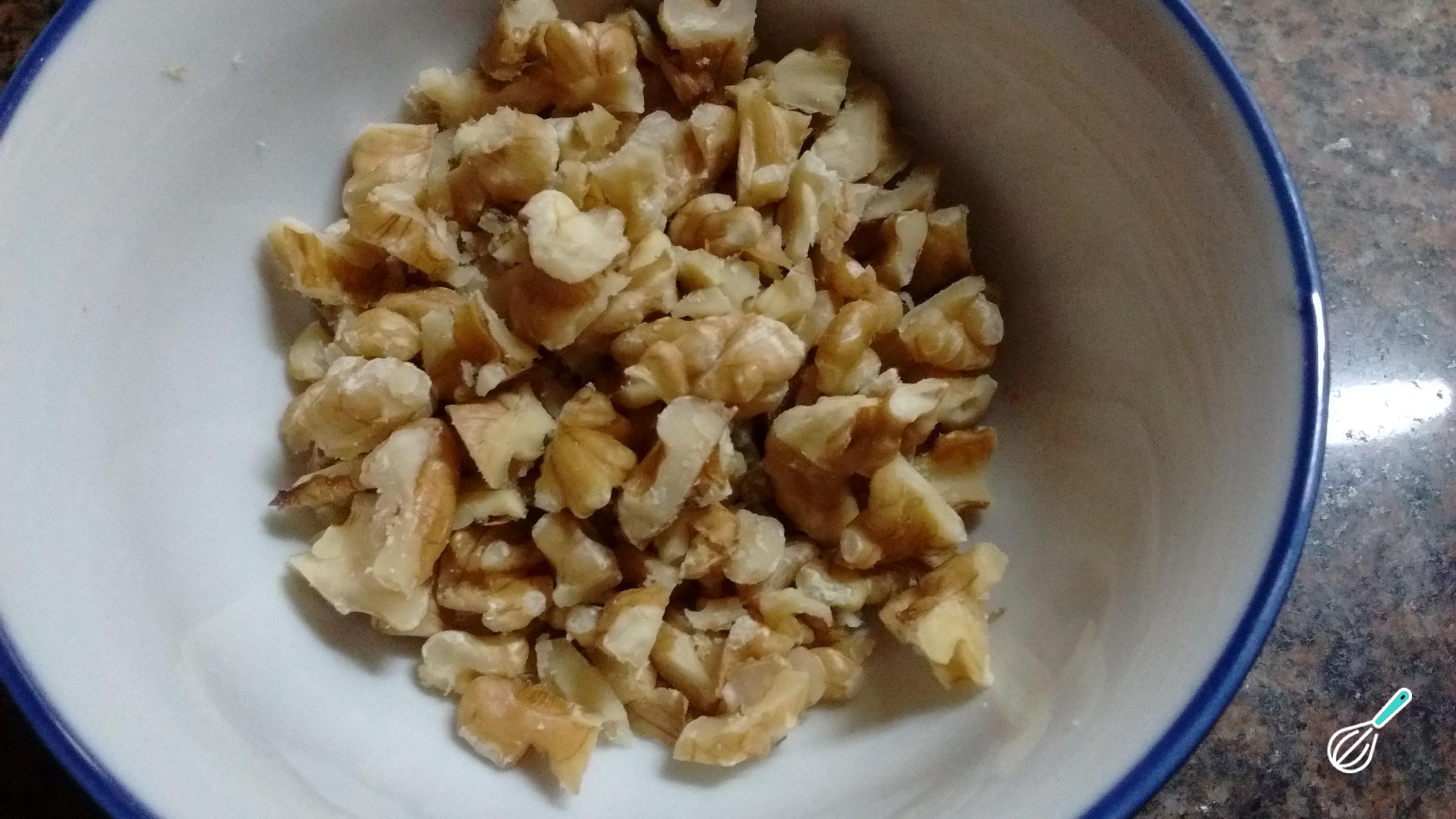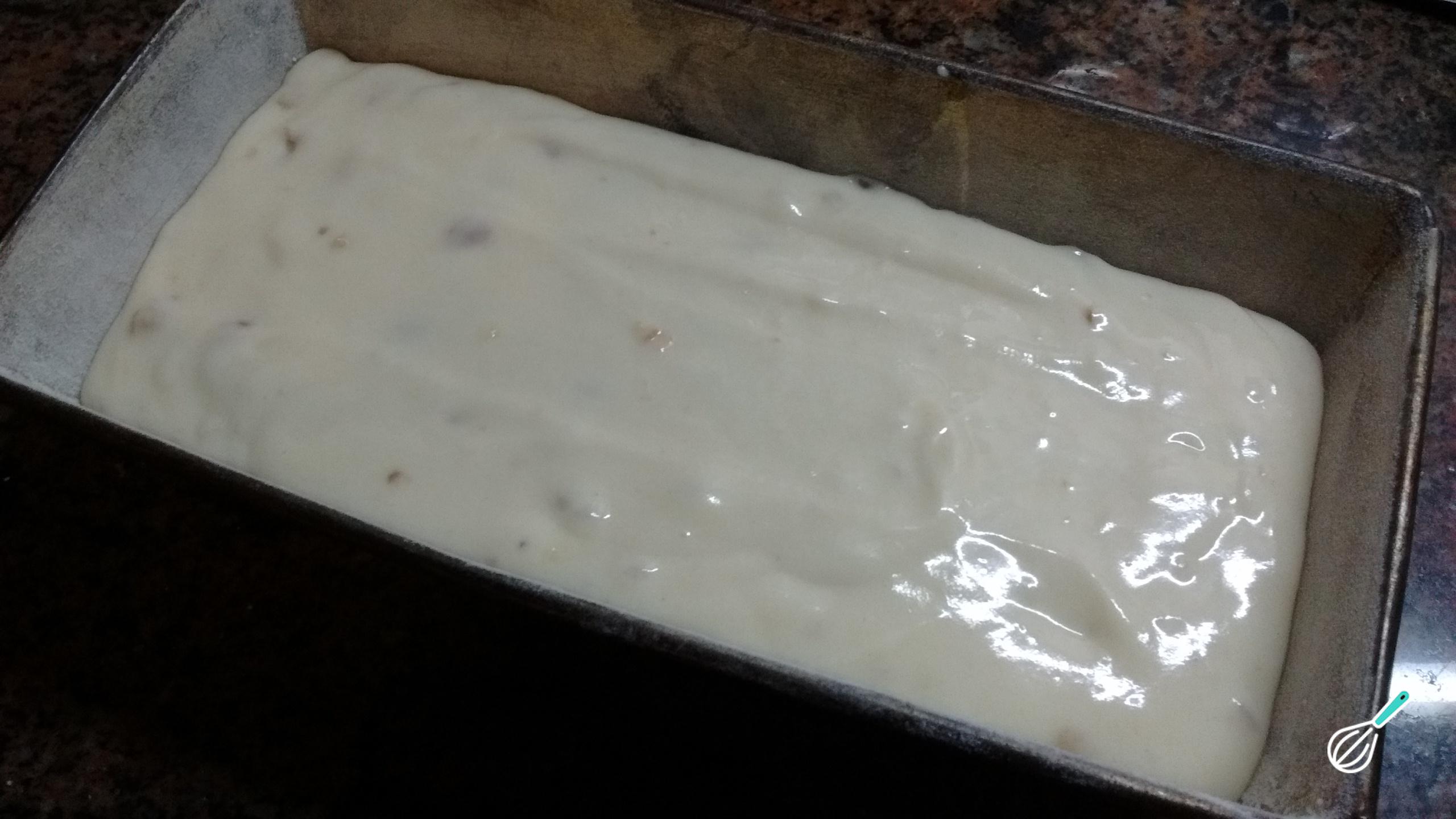 Antes de iniciar o preparo, ligue o forno a 180 ºC para preaquecer, unte com manteiga e enfarinhe uma forma de 24 x 9 x 6 cm . Também corte as nozes cruas não muito pequenas para que elas se destaquem quando você morder.