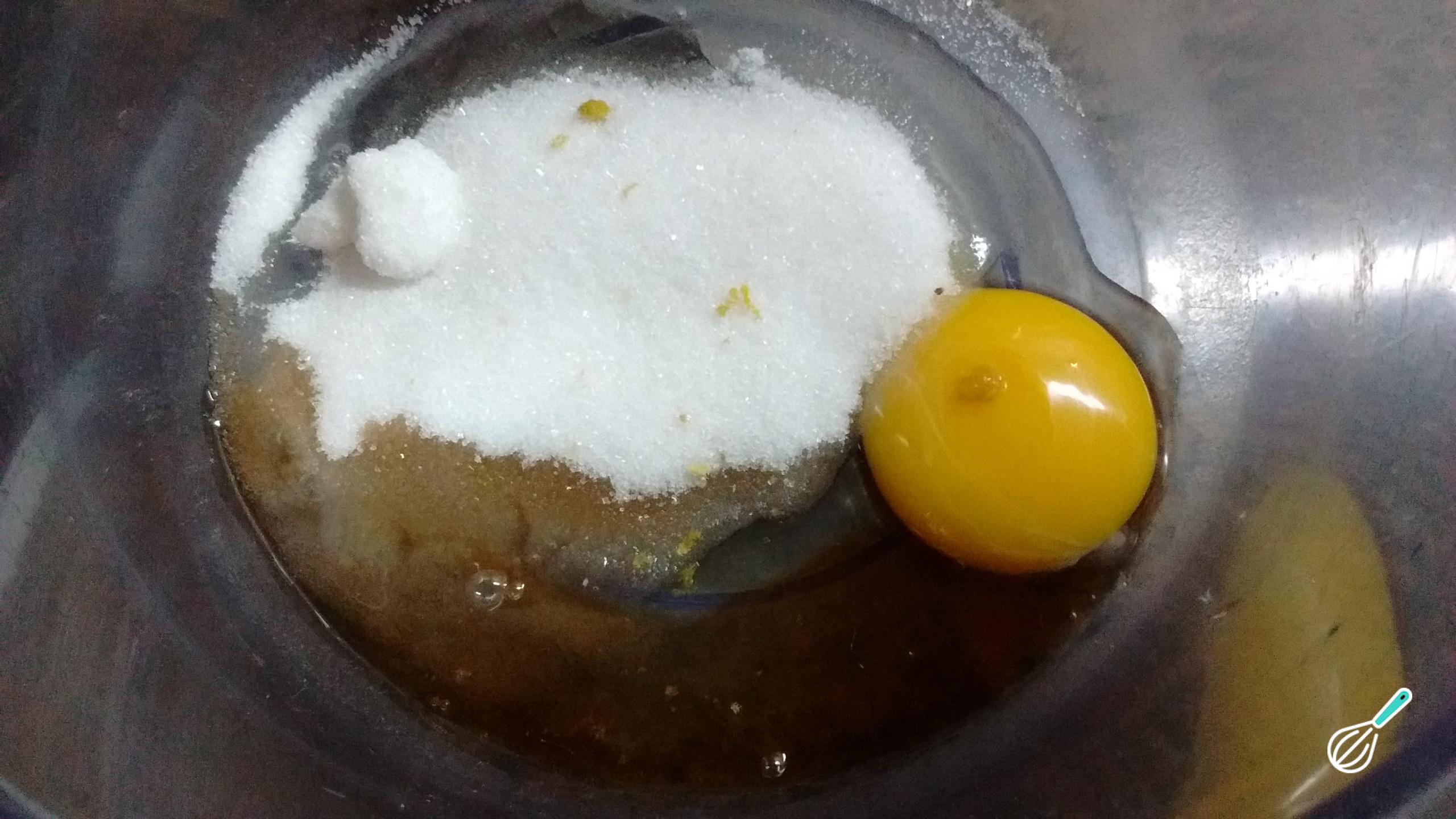 Coloque o ovo, o açúcar, a essência de baunilha e as raspas de limão em um recipiente. Bata até formar bolhas e ter uma cor esbranquiçada.