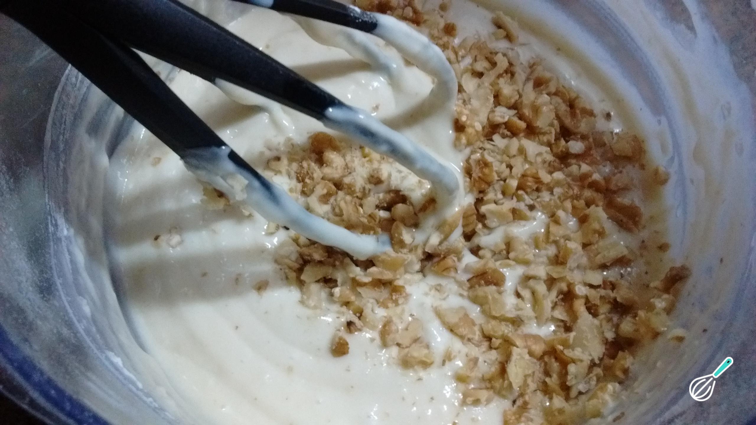 Por fim, adicione as nozes picadas e incorpore-as delicadamente na preparação com a espátula, tentando não baixar a massa.
