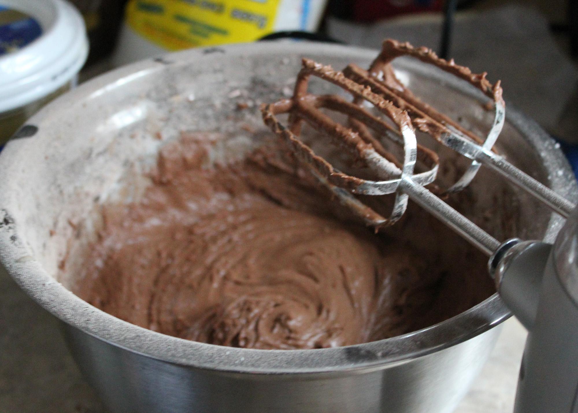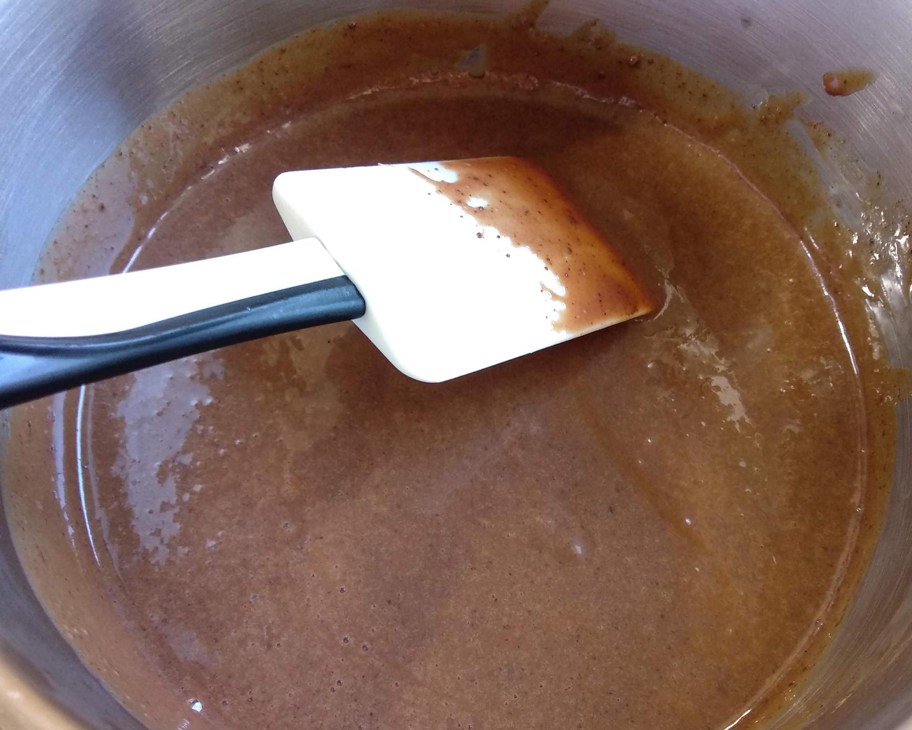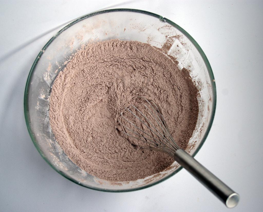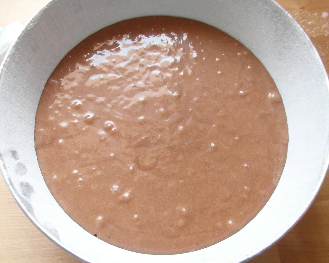 Pouco a pouco coloque os ingredientes secos peneirados na mistura dos ingredientes líquidos e mexa ou bata muito bem, até eliminar os grumos. O resultado será uma massa de bolo de chocolate cremosa e macia.