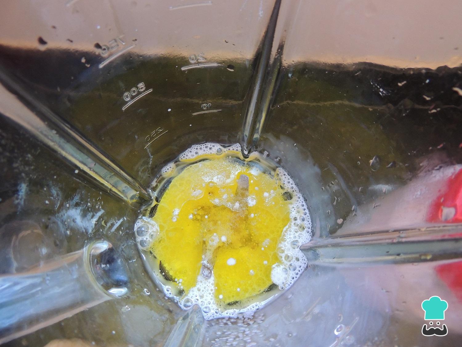 Em seguida bata os ovos no liquidificador por 30 segundos. Adicione o açúcar e continue batendo por mais 30 segundos.