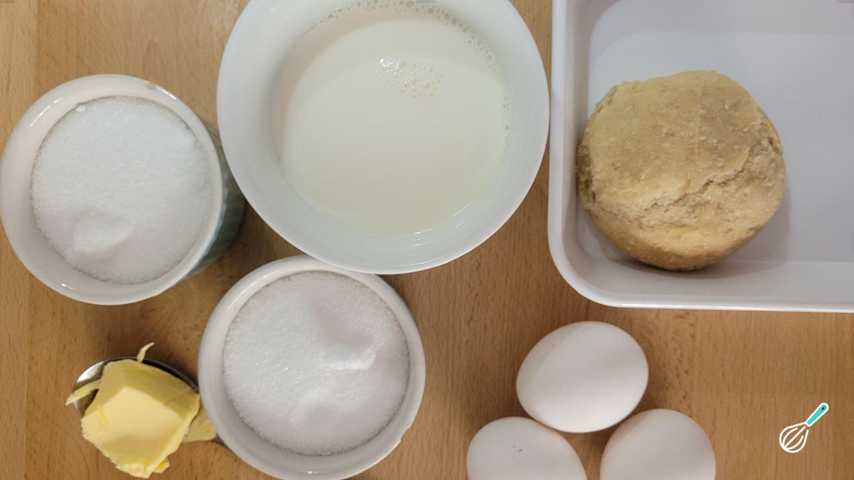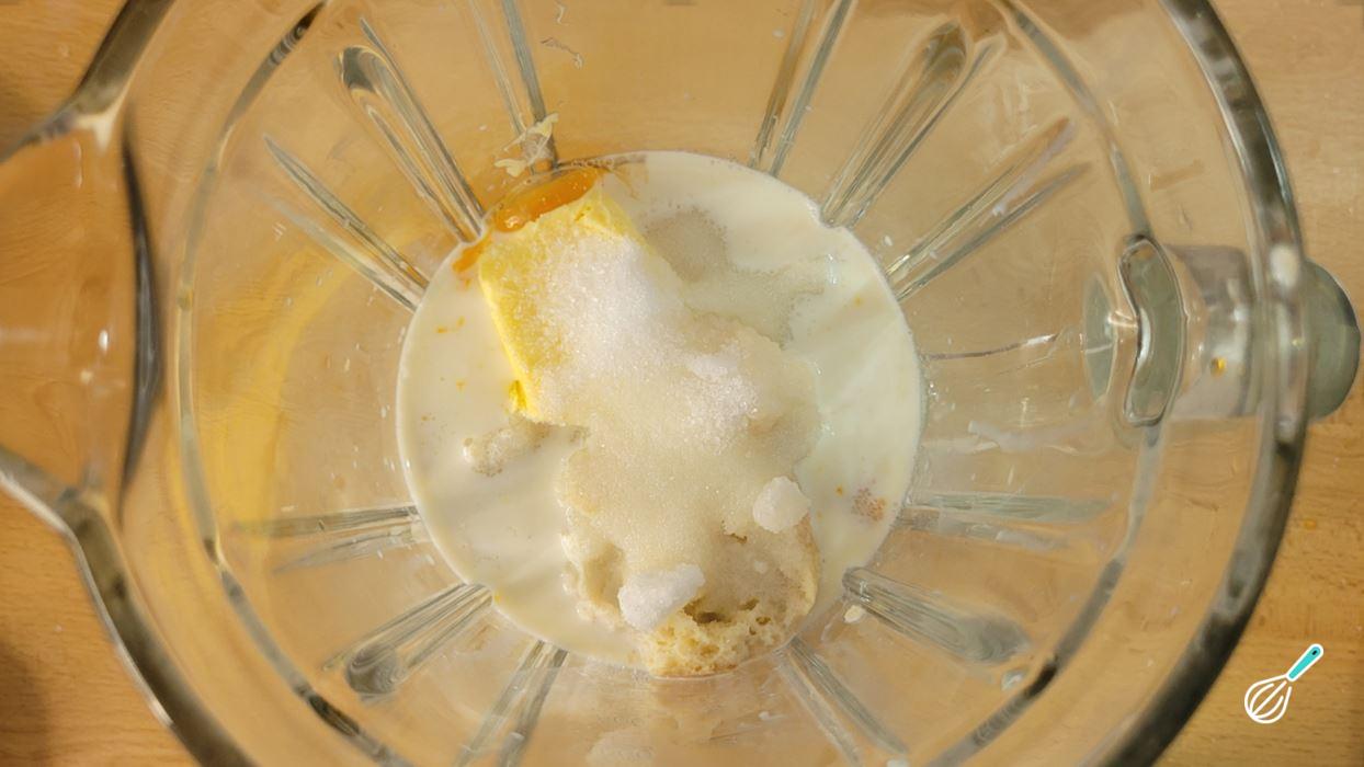 No liquidificador, coloque os ovos, o açúcar, a manteiga e o pão amolecido com o leite.