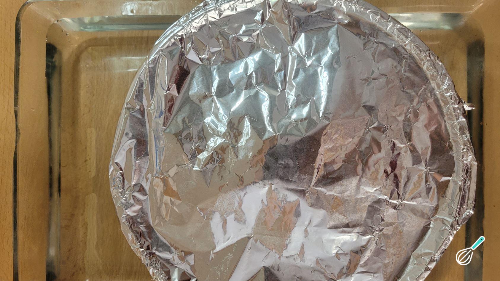 Cubra com papel alumínio para evitar que o vapor dentro do forno condense em cima do bolo. Asse em forno pré-aquecido a 180oC por 40 minutos ou até ver que o bolo está firme.