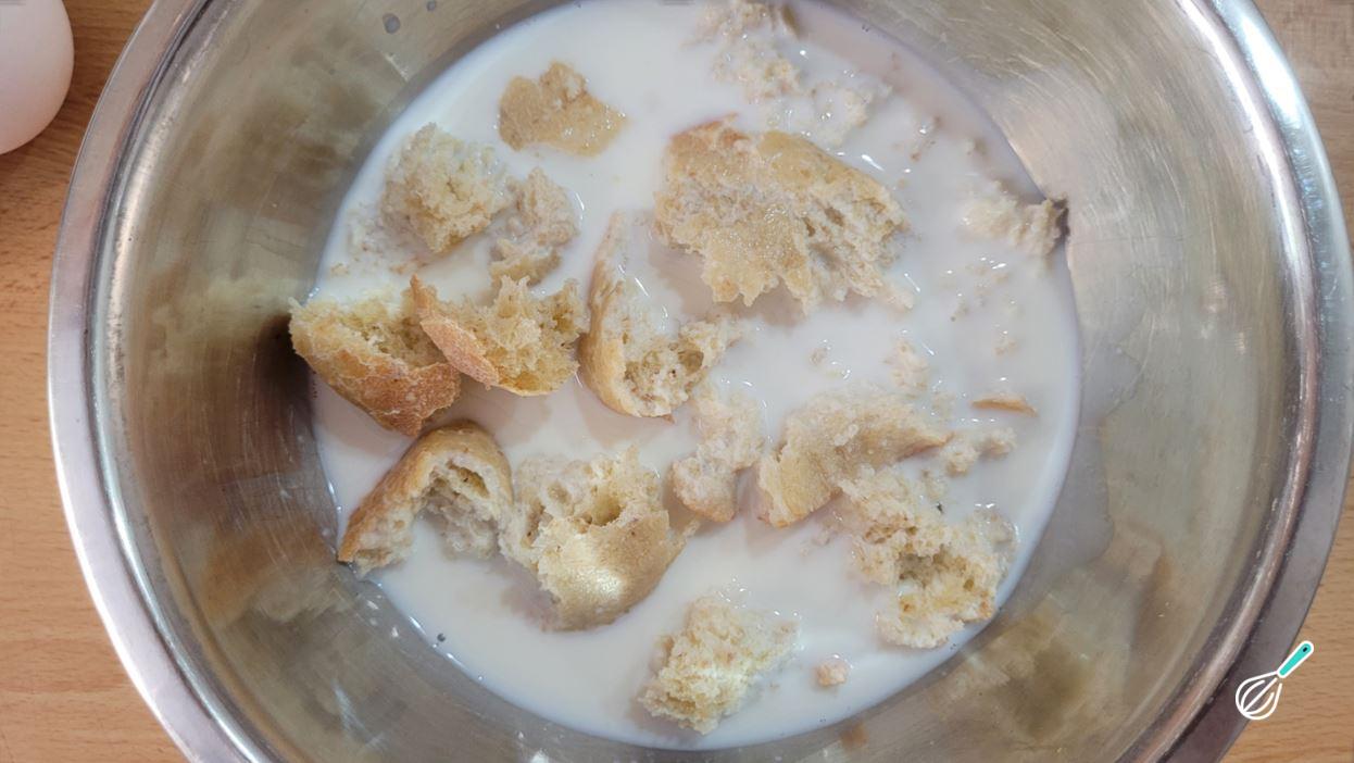 Corte o pão em pedaços com as mãos e coloque em uma tigela. Cubra com o leite e reserve por uns 10 minutos para que o pão absorva.