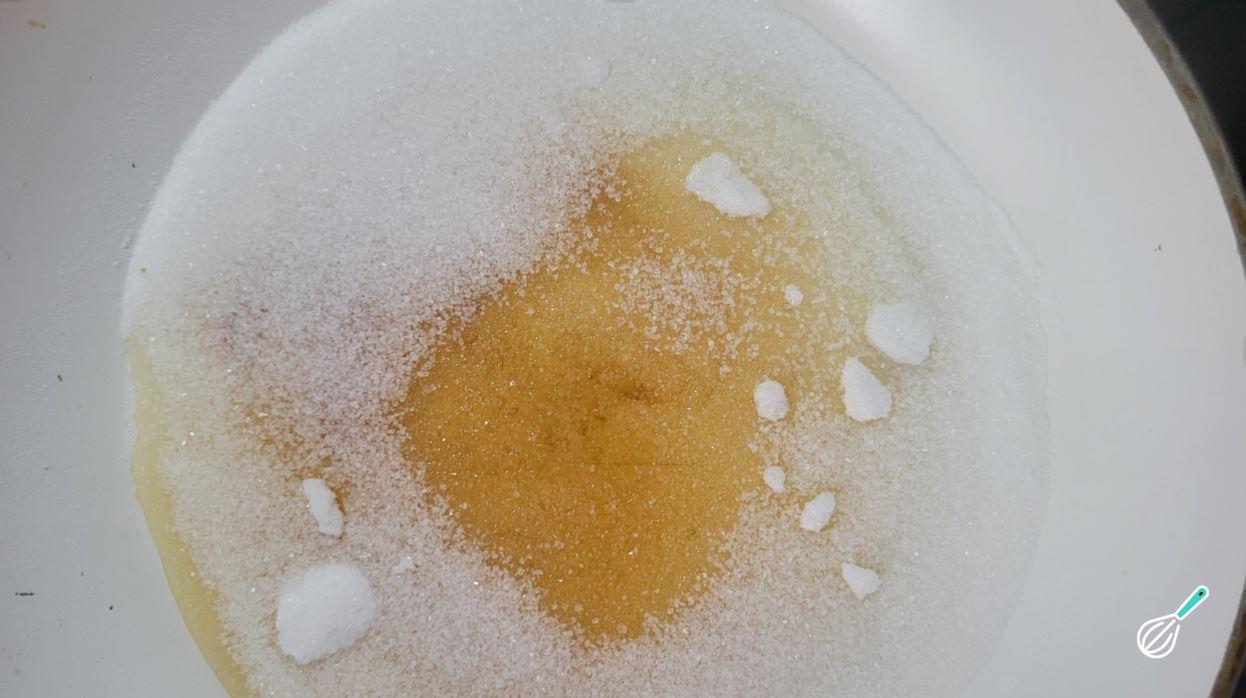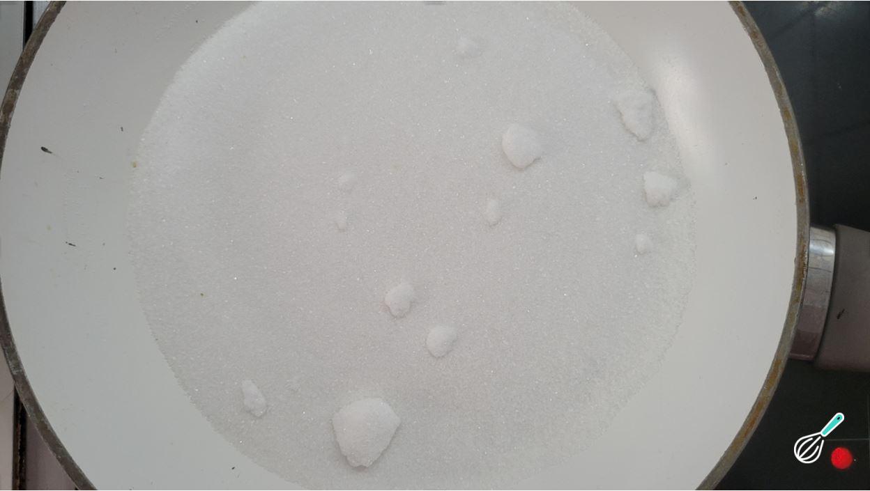 Enquanto isso, faça a calda de caramelo. Coloque o açúcar em uma frigideira fria, espalhando bem para formar uma camada fina e uniforme sobre todo o fundo.