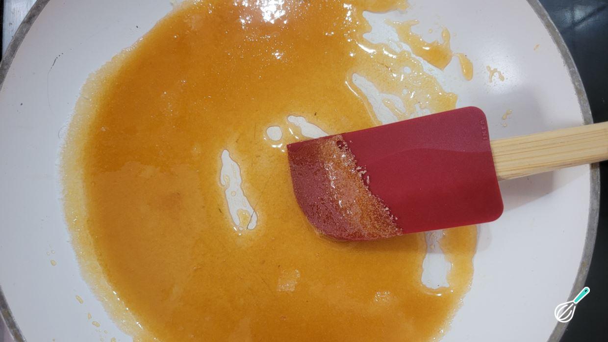 Quando o açúcar começar a derreter, pode mexer com uma espátula.