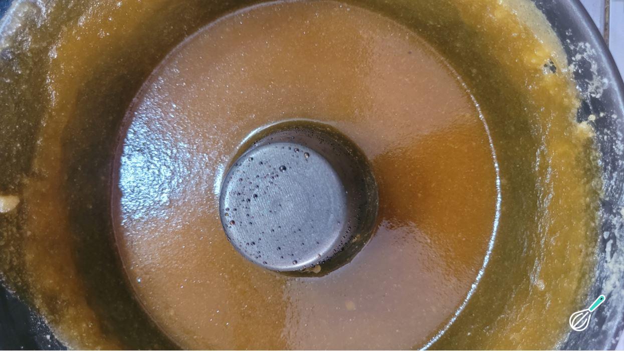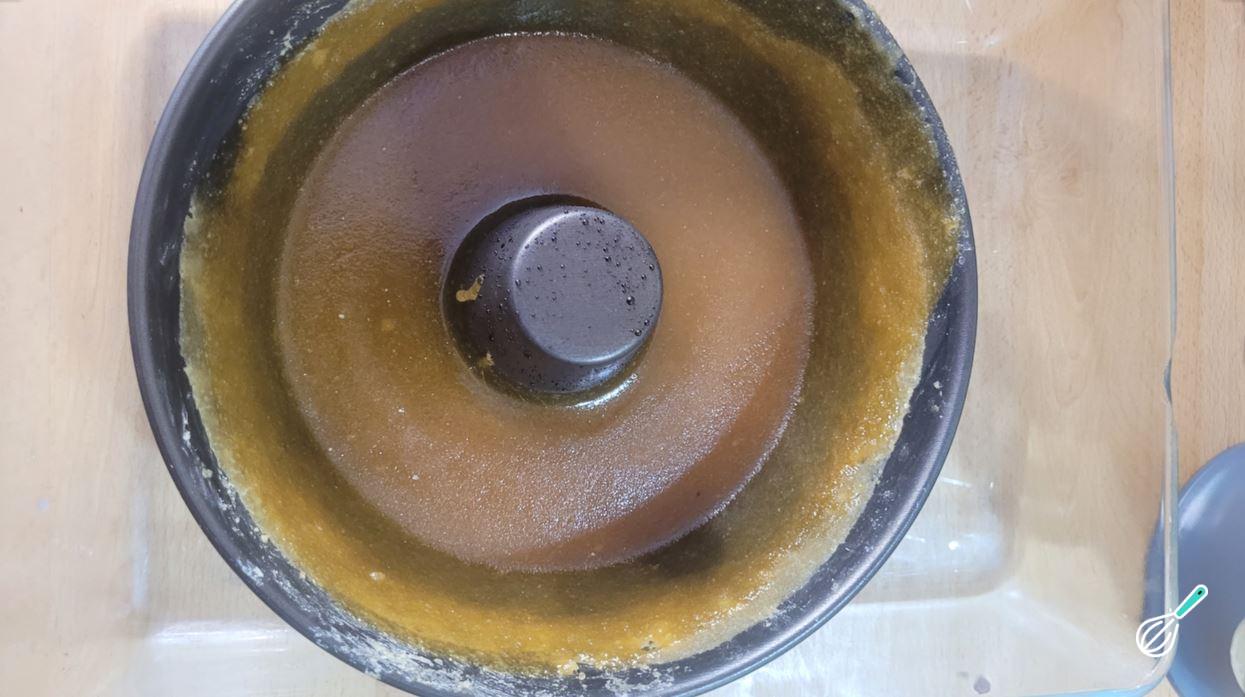 Despeje o caramelo em uma forma com furo, espalhando sobre o fundo e as laterais.