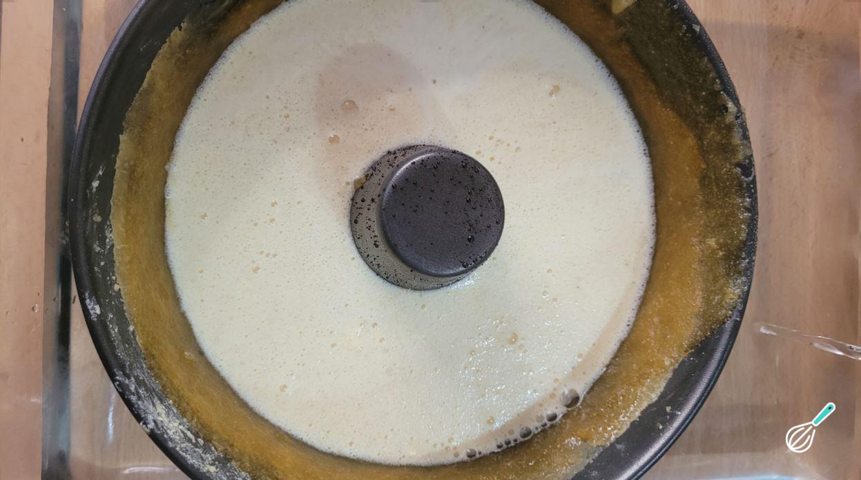 Despeje a massa na forma sobre o caramelo e encha uma assadeira com água até ficar mais ou menos na metade da forma de bolo para assar o bolo em banho maria.