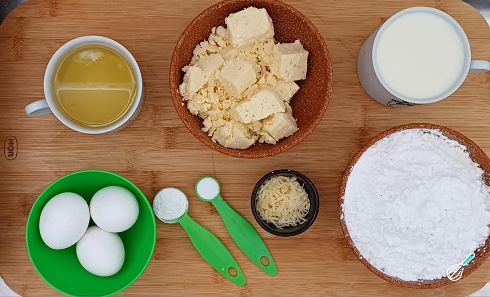 Você vai precisar de queijo (aqui nós usamos o queijo coalho, mas pode usar outro queijo, se quiser), polvilho doce, ovos, leite, óleo e queijo parmesão!