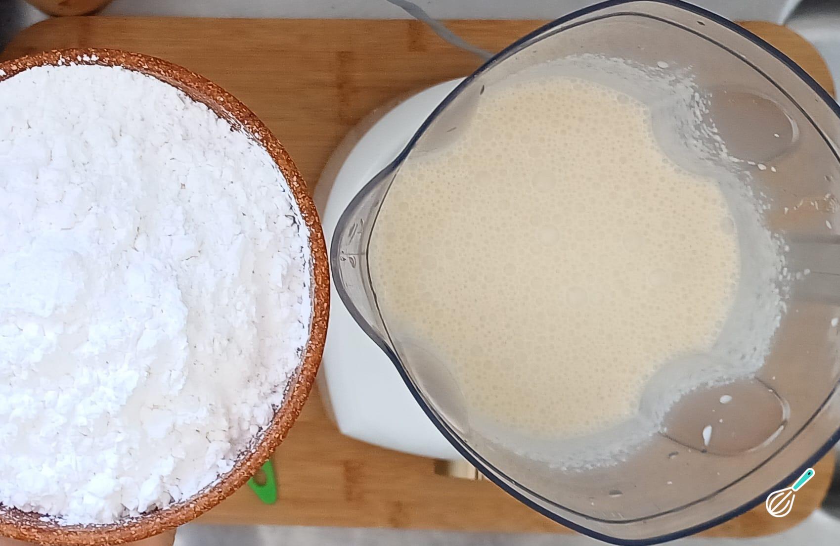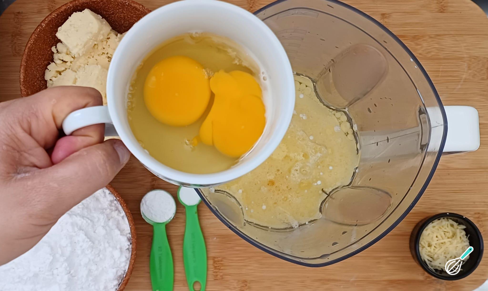 Acrescente o polvilho doce, o sal e o fermento em pó e bata mais um pouco até que forme um creme liso.