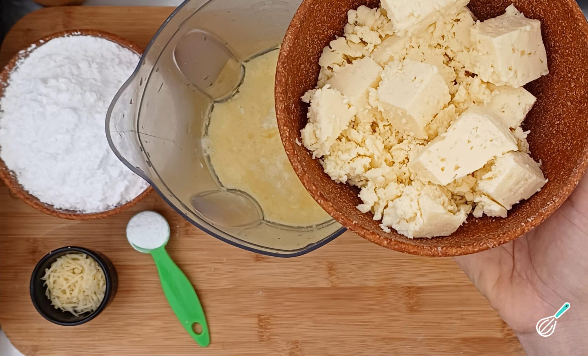 Adicione o queijo coalho em pedaços e bata bem até ficar homogêneo.