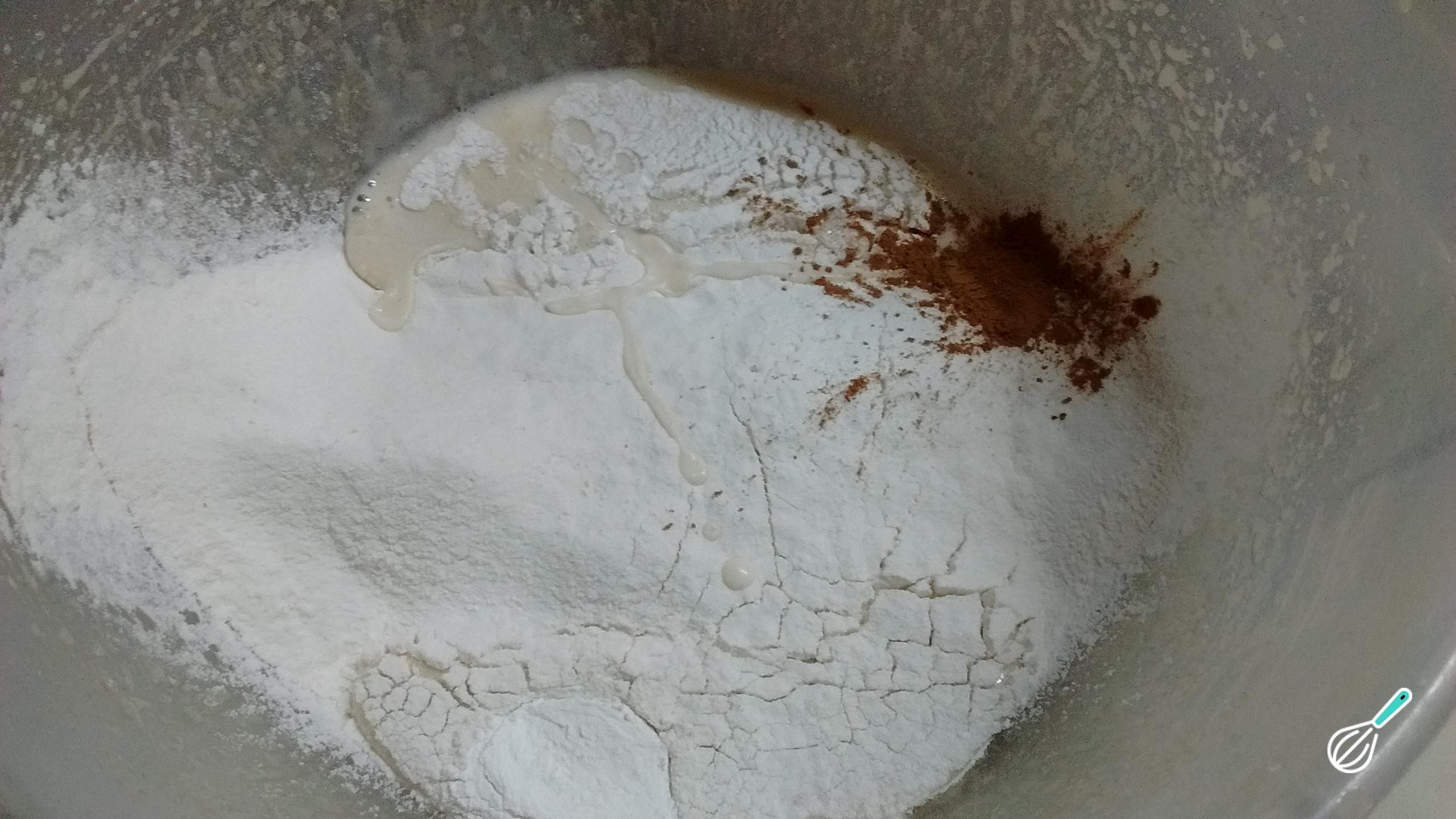Adicione os ingredientes secos previamente peneirados para evitar grumos. Ou seja, acrescente a farinha, o fermento, a canela e o bicarbonato .