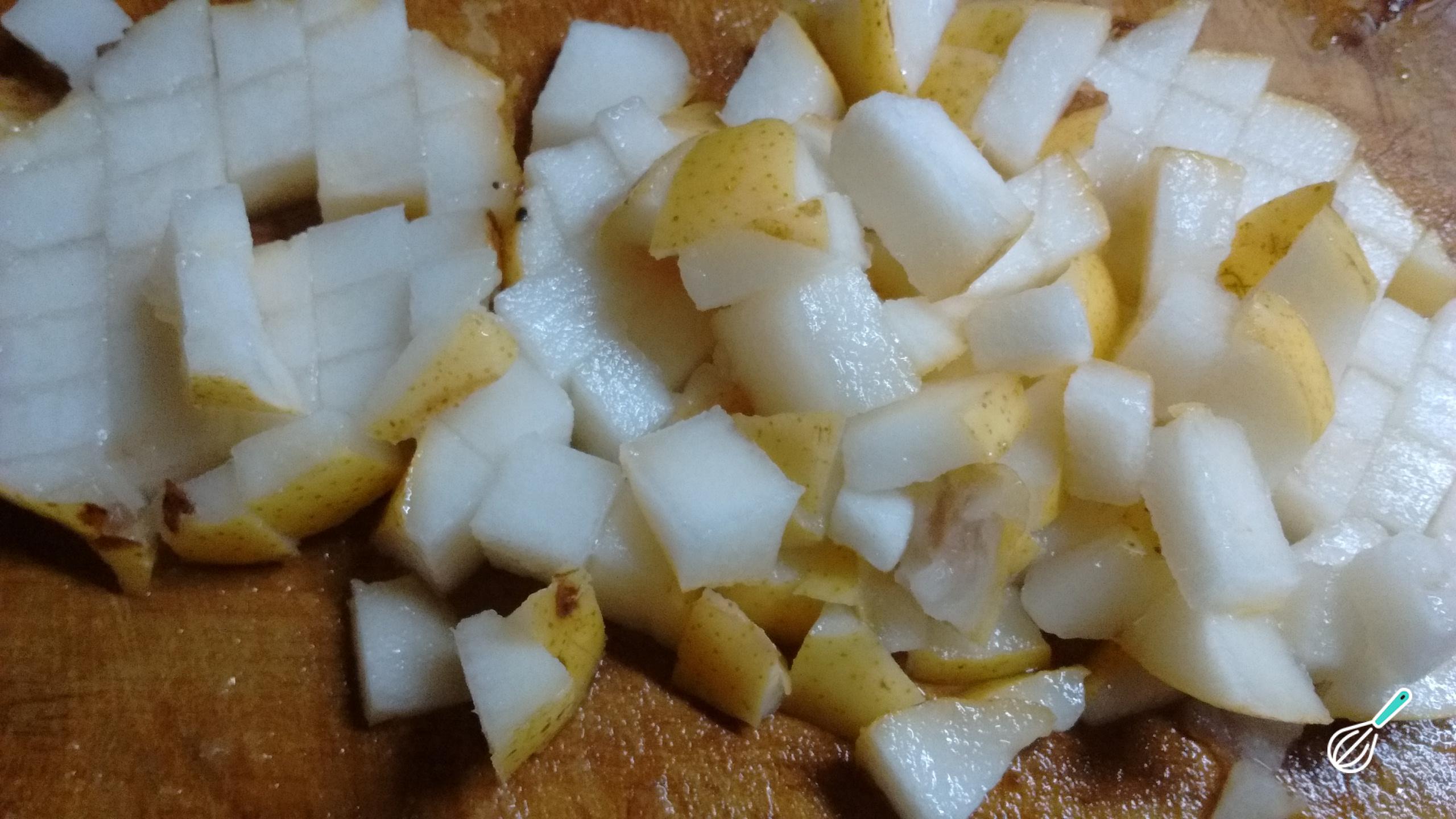 Por outro lado, lave e corte a pera em cubos pequenos, retirando as sementes, o talo e o miolo mais duro. Se não gostar deste formato para incorporar a pera no seu bolo, pode descascá-la, processá-la ou adicioná-la no final sobre a massa já pronta na forma e em rodelas.