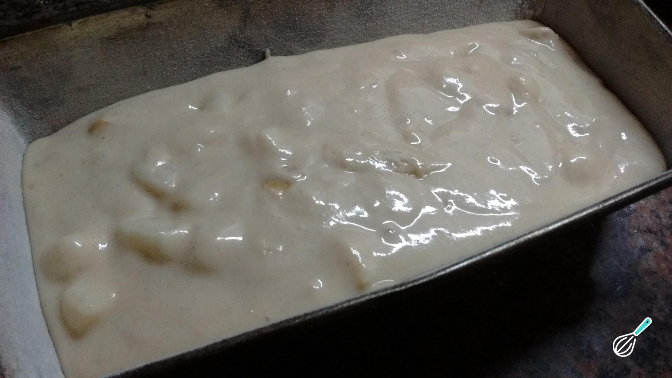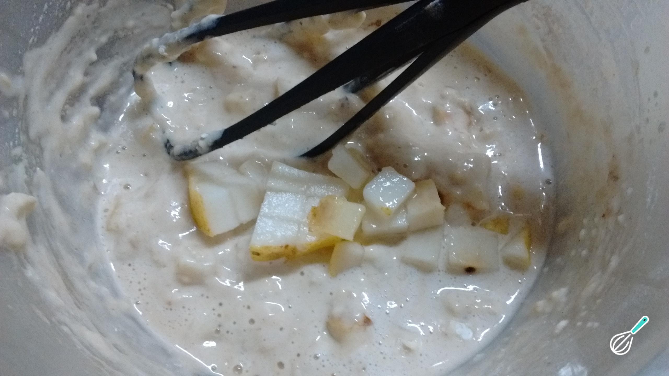 Adicione a pera cortada à preparação do seu bolo, juntamente com o leite. Integre com movimentos envolventes para não perder muito ar do incorporado durante a batida. Também não bata muito o preparado senão o bolo ficará um pouco duro.
