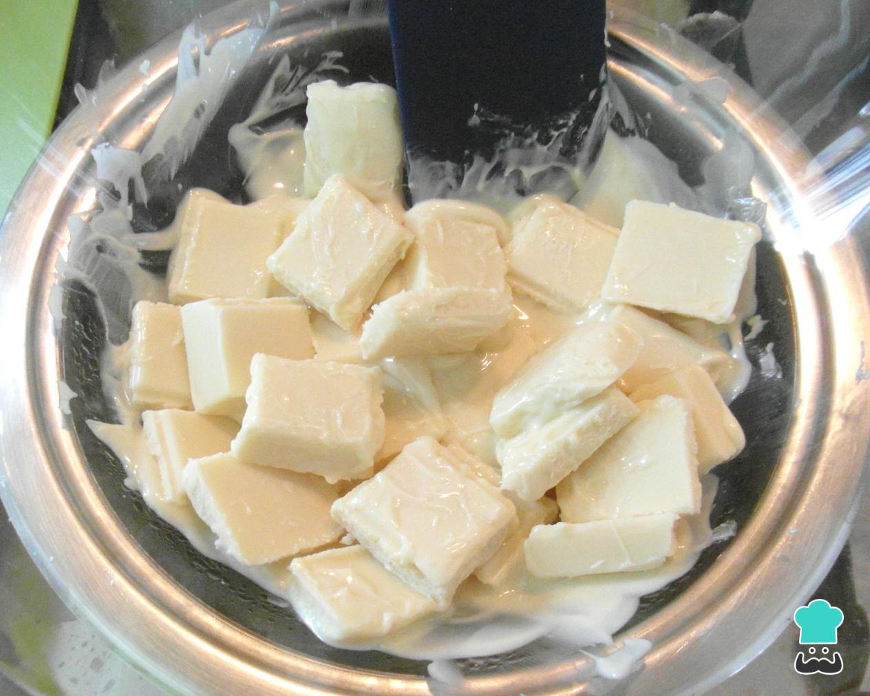 Derreta o chocolate branco no microondas (derretendo em ciclos de 20 segundos e retirando para mexer) ou em banho-maria no fogo. Adicione a manteiga e misture, para deixar o chocolate mais brilhante.
