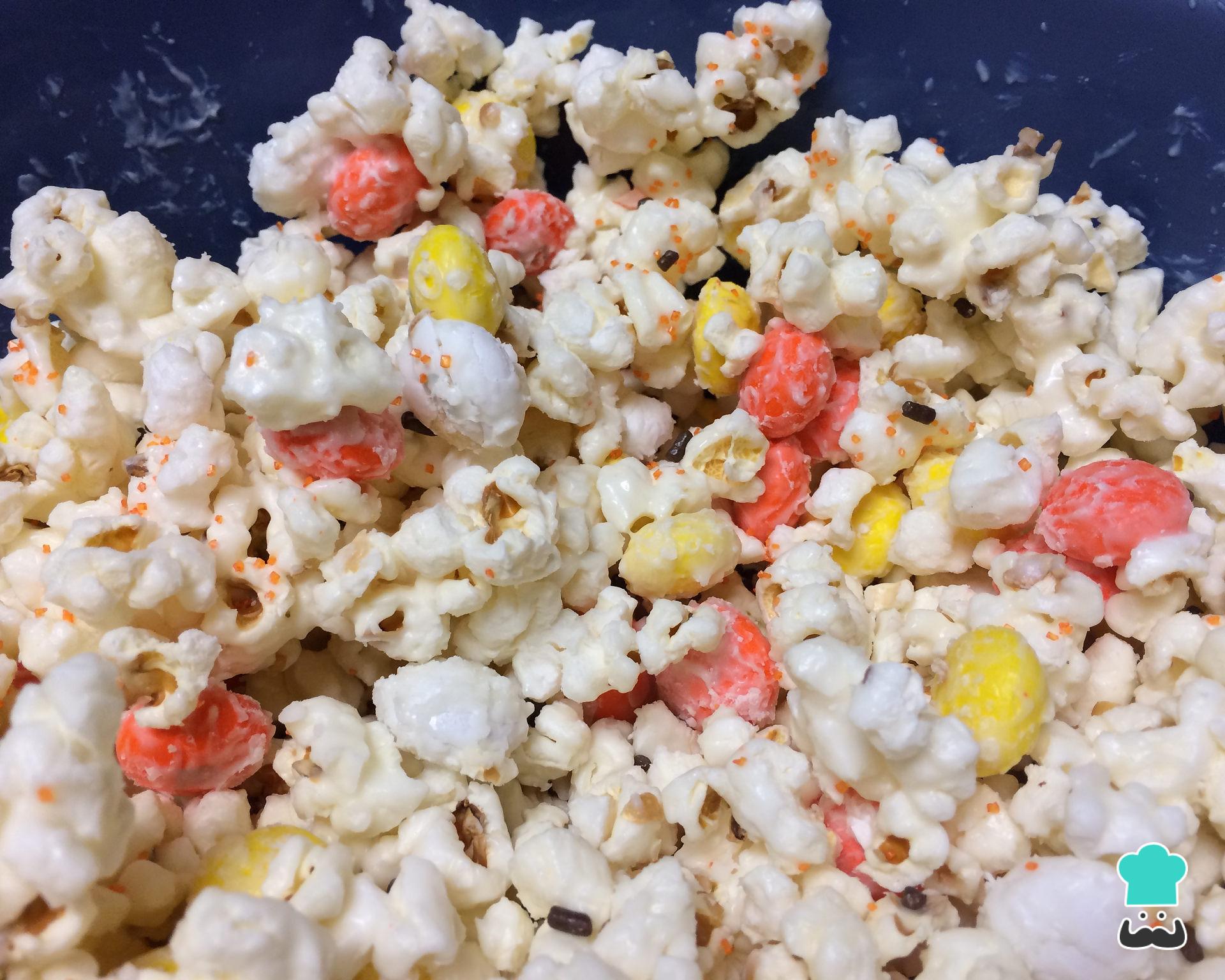 Adicione o chocolate branco à pipoca e envolva até que todas as pipocas fiquem coberturas. Acrescente também o amendoim e as balas de M&M's e volte a misturar. Coloque numa forma de bolo untada e pressione bem com uma colher, para que o bolo de pipoca fique bem compacto.