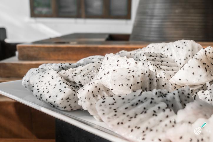 Para começar a fazer seu bolo de pitaya, o primeiro passo é descascar e cortar a pitaya em pedaços pequenos.