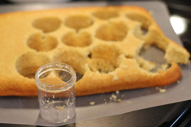 Quando o bolo estiver assado, retire e deixe esfriar. Depois corte discos de bolo usando um cortador redondo ou um potinho.