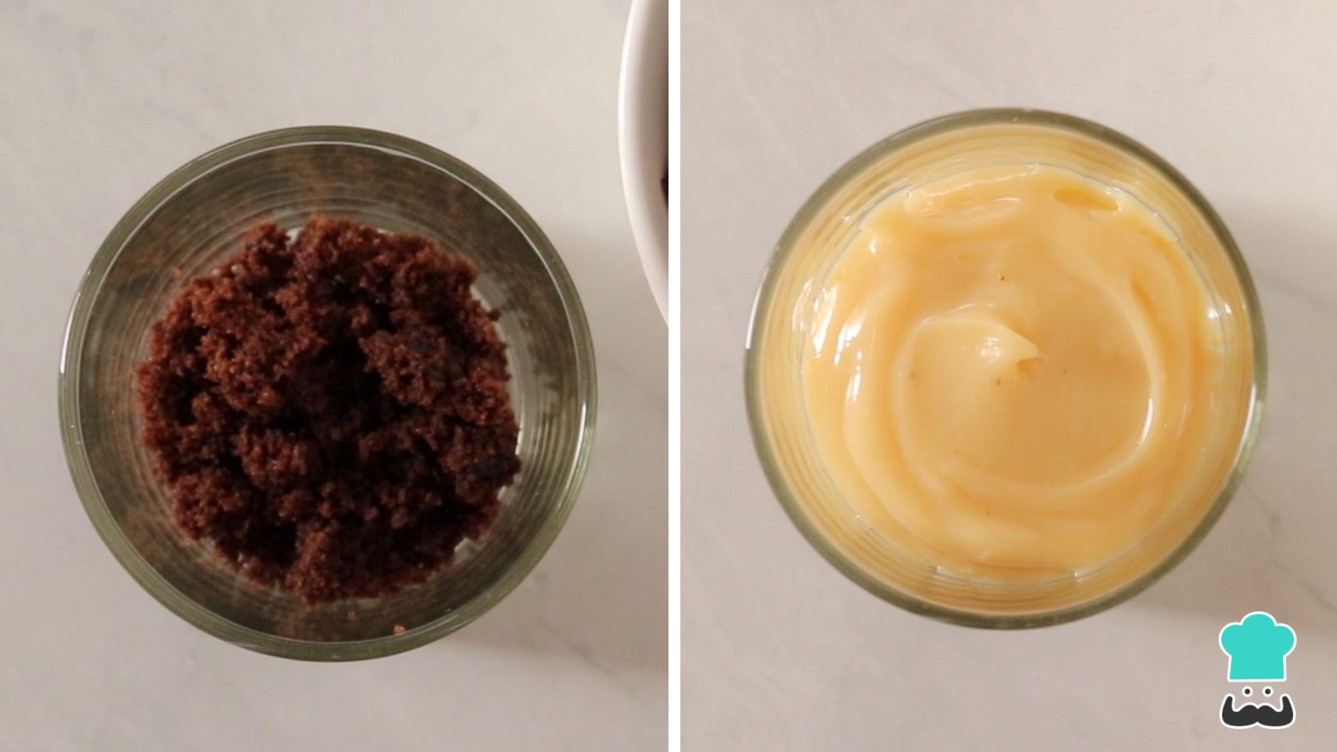 Agora é só montar o seu bolo no pote ou no copinho, alternando camadas de bolo e de recheio até à borda da embalagem.
