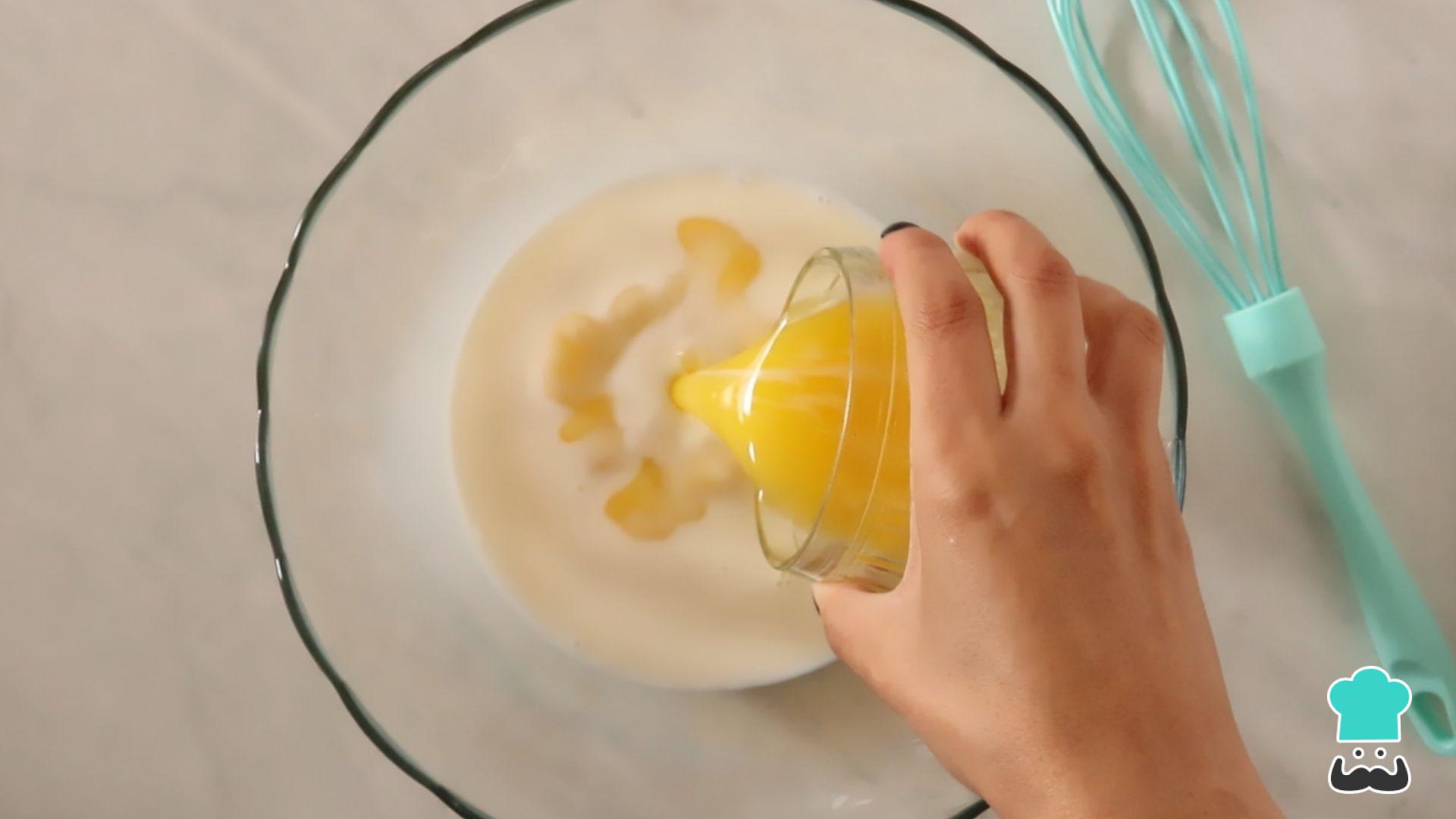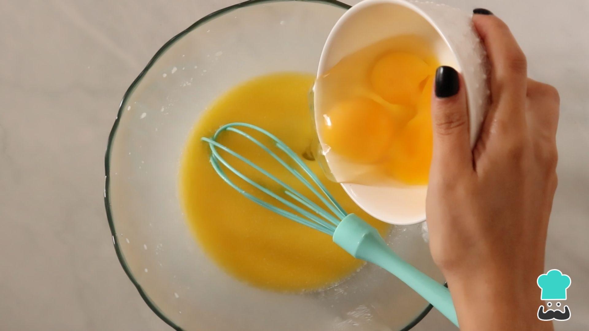 Verifique se a mistura não está quente devido à manteiga derretida. Se não estiver, adicione os ovos e bata bem; se estiver, reserve por alguns minutinhos para que esfrie um pouco.