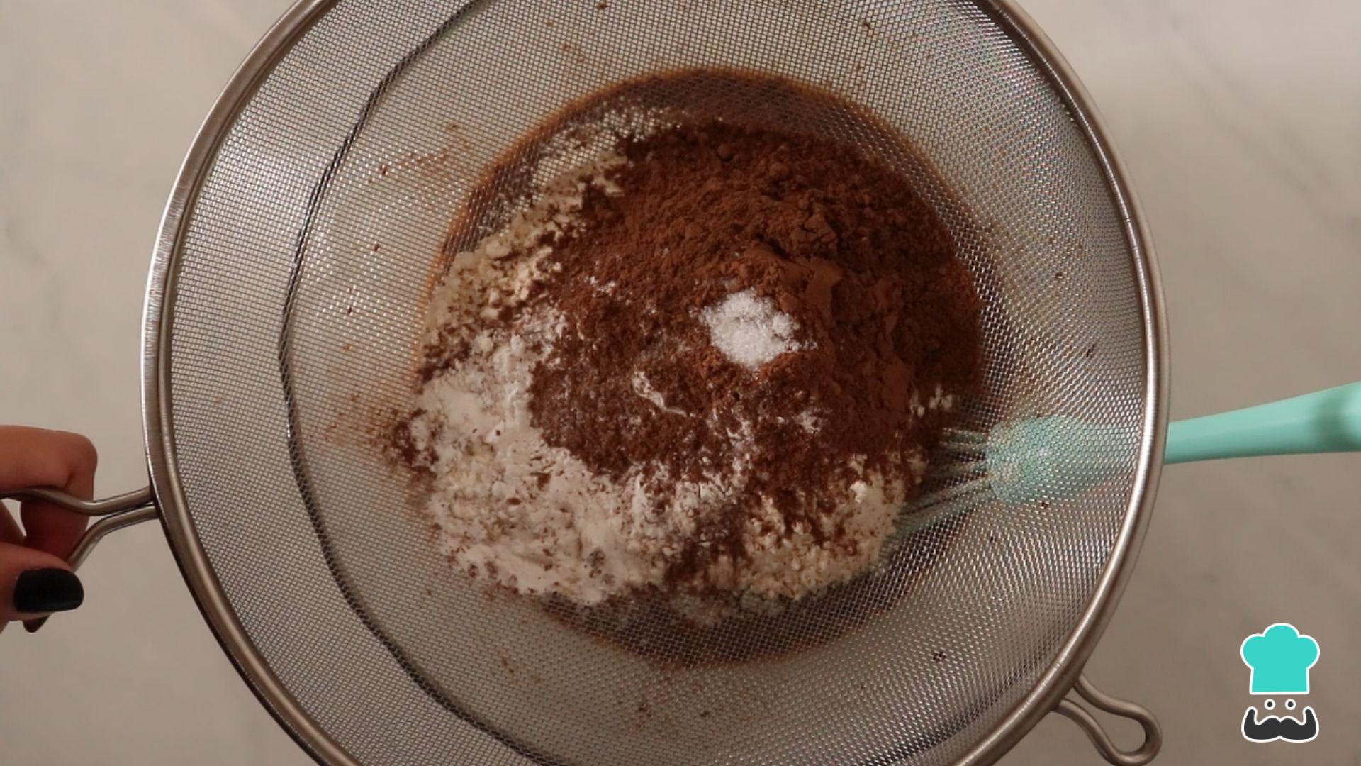 Em seguida adicione os outros secos, passando por uma peneira: farinha de trigo, fermento em pó e cacau em pó.