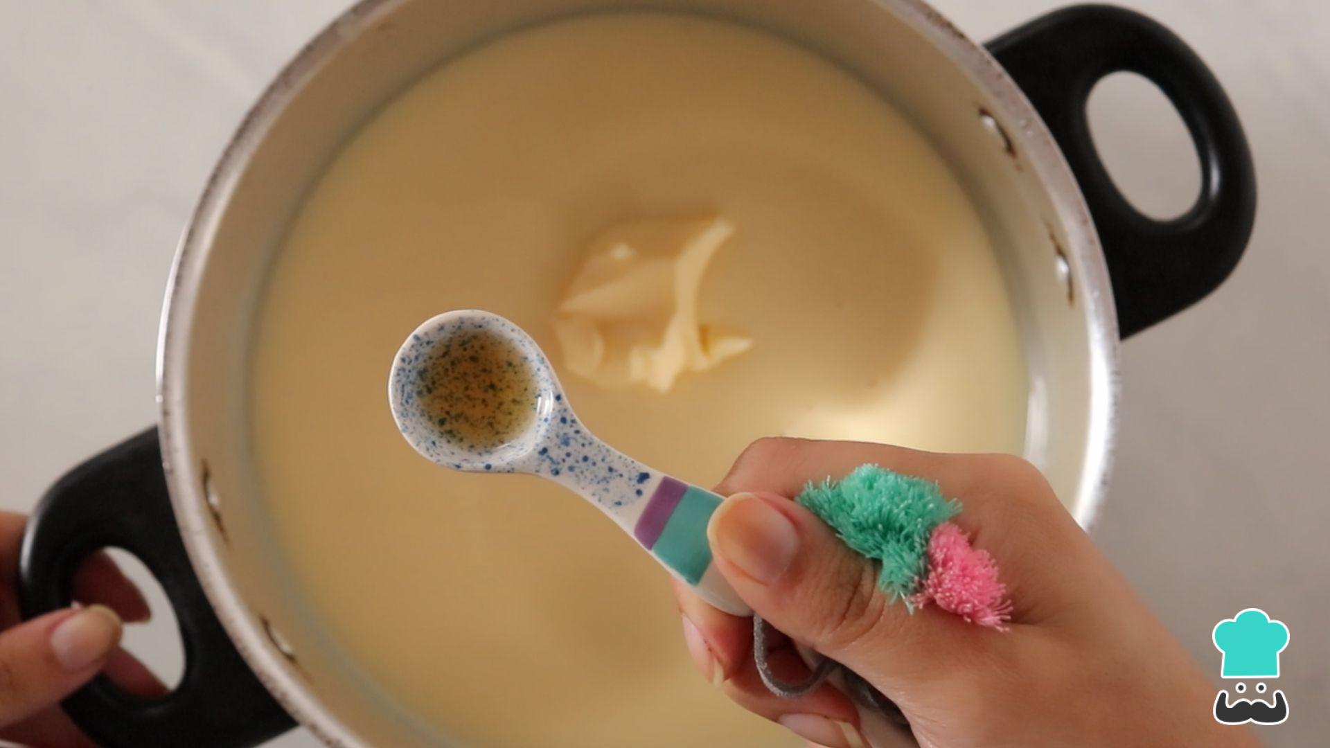 Enquanto o bolo assa, vamos preparar o recheio/cobertura de brigadeiro branco: coloque todos os ingredientes na panela.