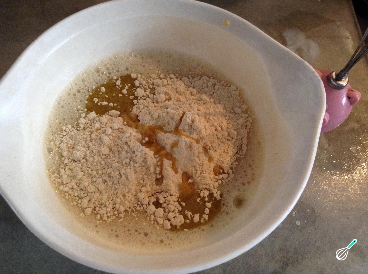 Por fim, adicione a farinha de milho peneirada. Misture para combinar todos os ingredientes da massa do bolo quinoa.
