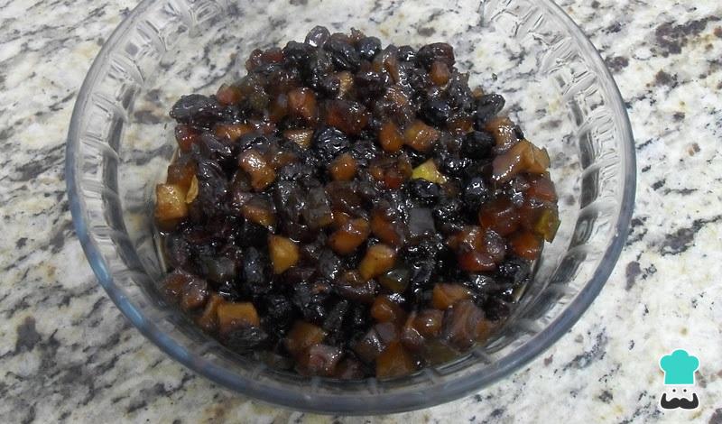 Comece o preparo do bolo de reis colocando as frutas secas e cristalizadas de molho no conhaque. Reserve.