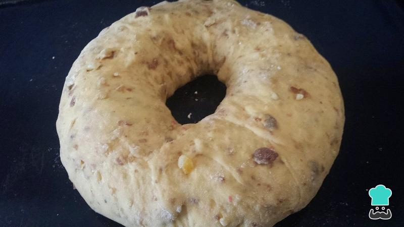 Acrescente as frutas com o conhaque, mexa para envolver tudo e verta a massa do bolo de reis numa forma de furo central, untada e enfarinhada. Como alternativa pode moldar a massa em forma de coroa e colocar num tabuleiro de forno também untado e enfarinhado.