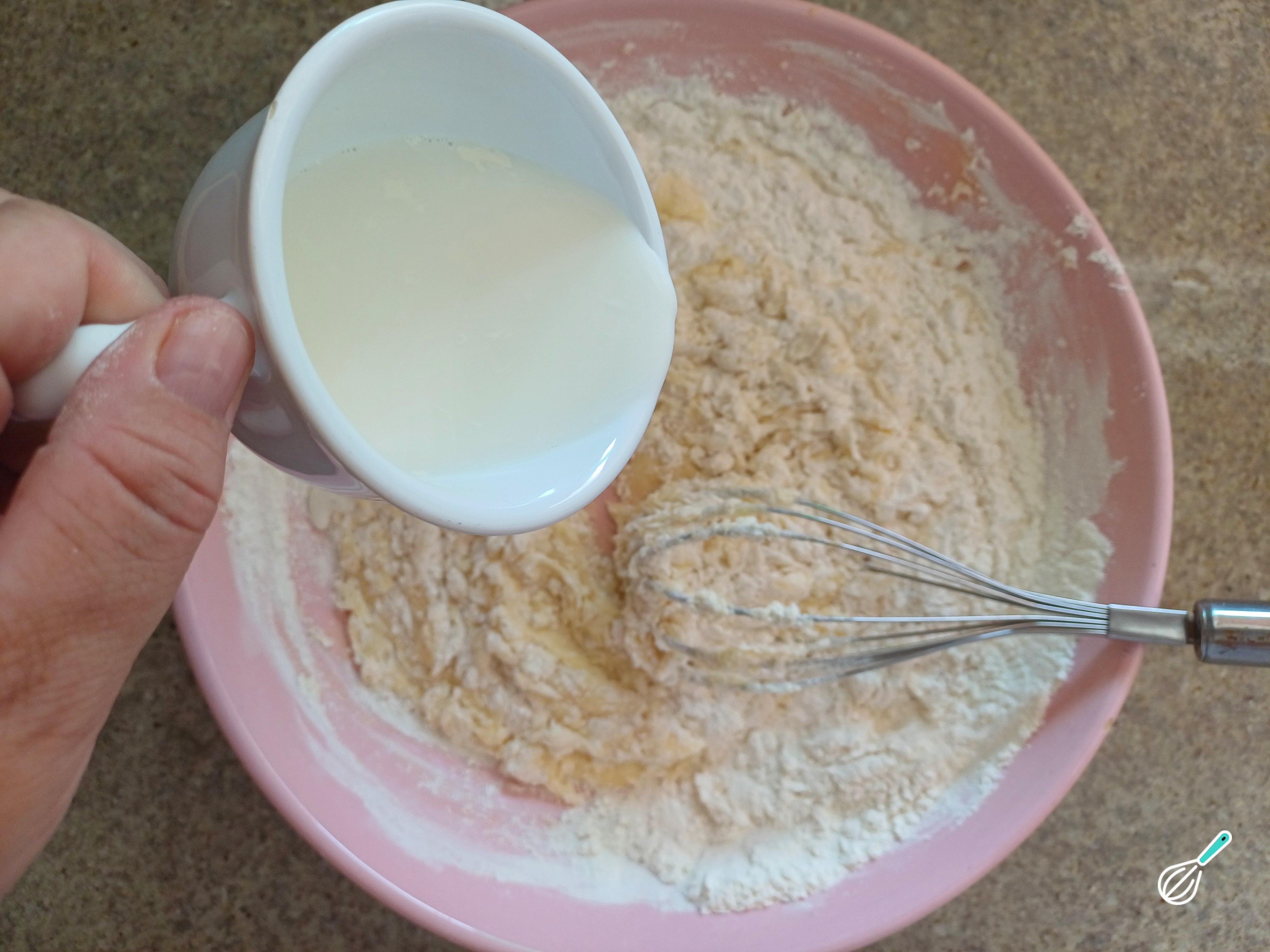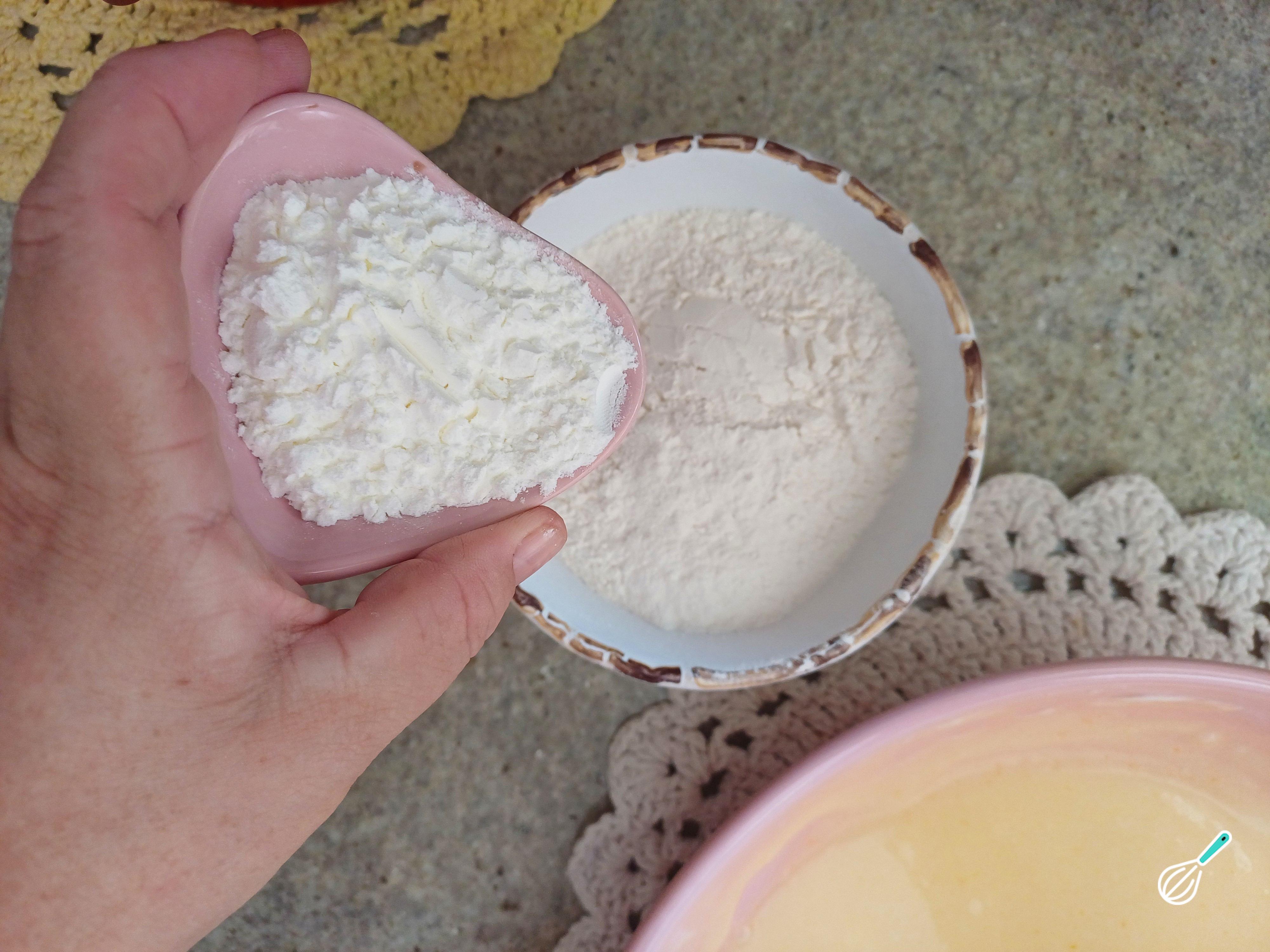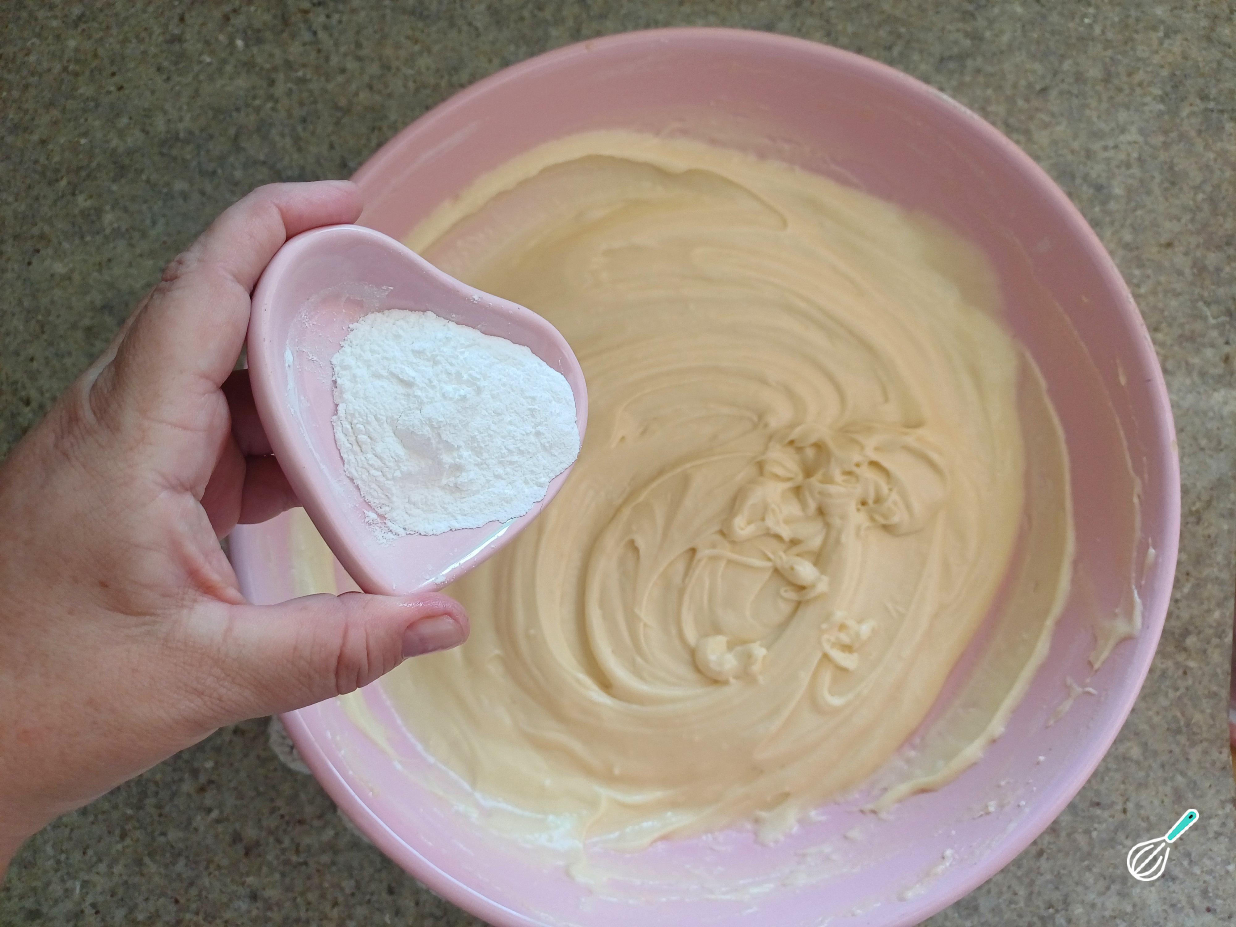 Peneire a farinha de trigo e o amido de milho e misture. Acrescente essa mistura de secos à massa.