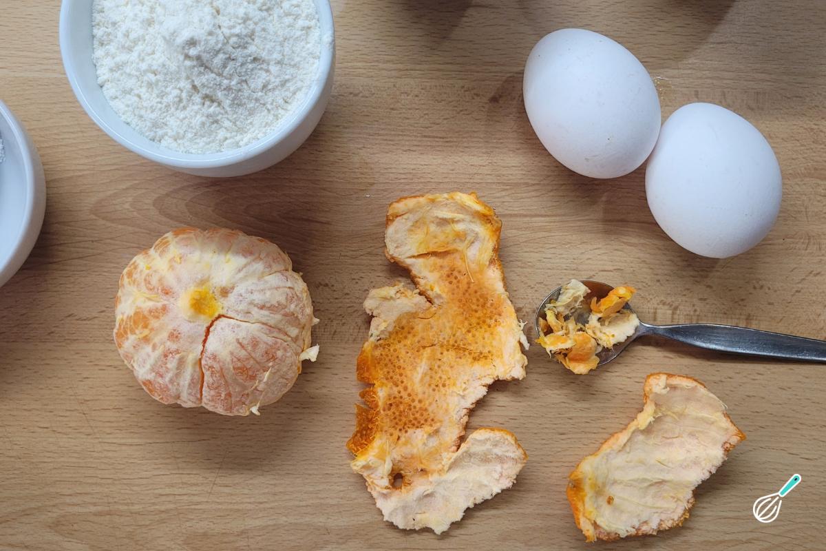 Para começar, descasque a tangerina e com o auxílio de uma colher, retire a parte branca do interior da casca - isso vai evitar o amargor ao bater a casca no liquidificador.