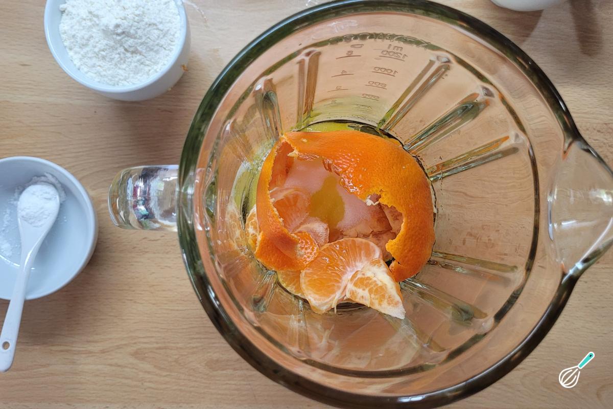 No liquidificador, coloque todos os ingredientes líquidos - os ovos e o óleo, junto com o açúcar, a tangerina e as cascas. Para facilitar na hora de bater, coloque os ingredientes líquidos por baixo. A farinha e o fermento serão incorporados depois sem bater.