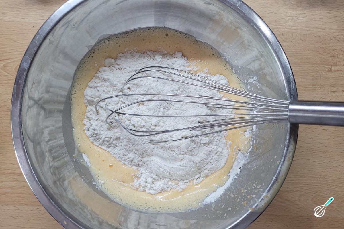 Adicione a farinha e misture bem com um batedor de arame. Evite bater demais para que o bolo não fique pesado, mas garanta que não haja mais nenhum gruminho.