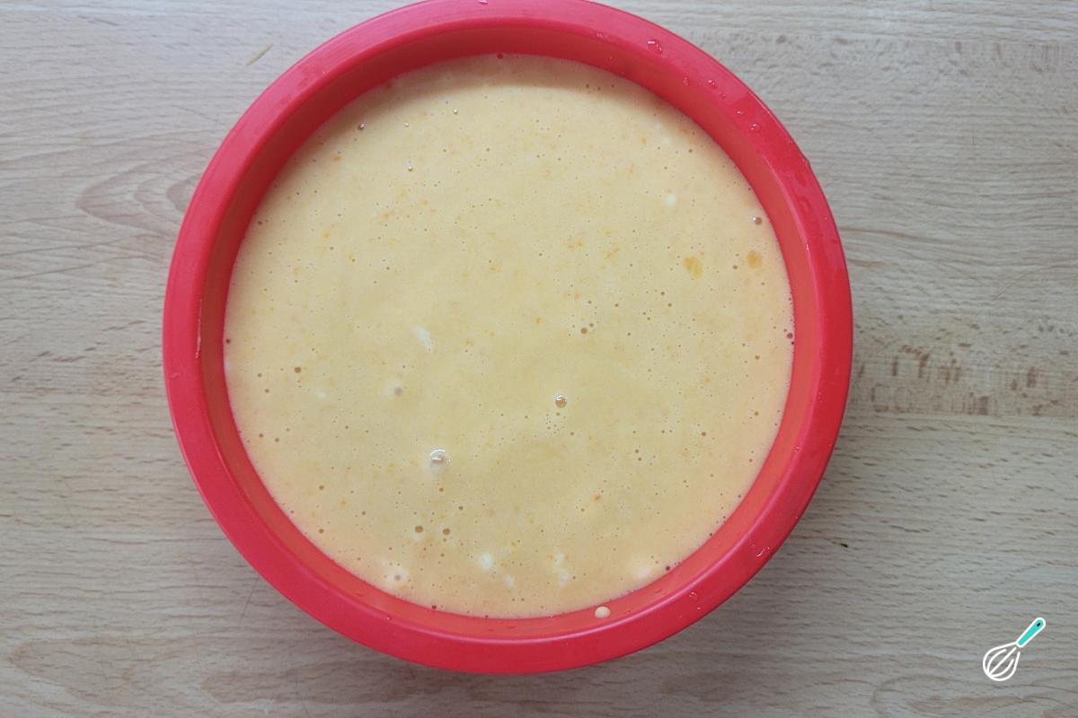 Transfira a massa para a forma. A minha forma era de silicone e não precisa untar, mas você pode untar a forma normalmente com manteiga e farinha de trigo. Leve ao forno pré-aquecido a 180oC por cerca de 40 minutos, fazendo o teste do palito para verificar se o bolo está assado.