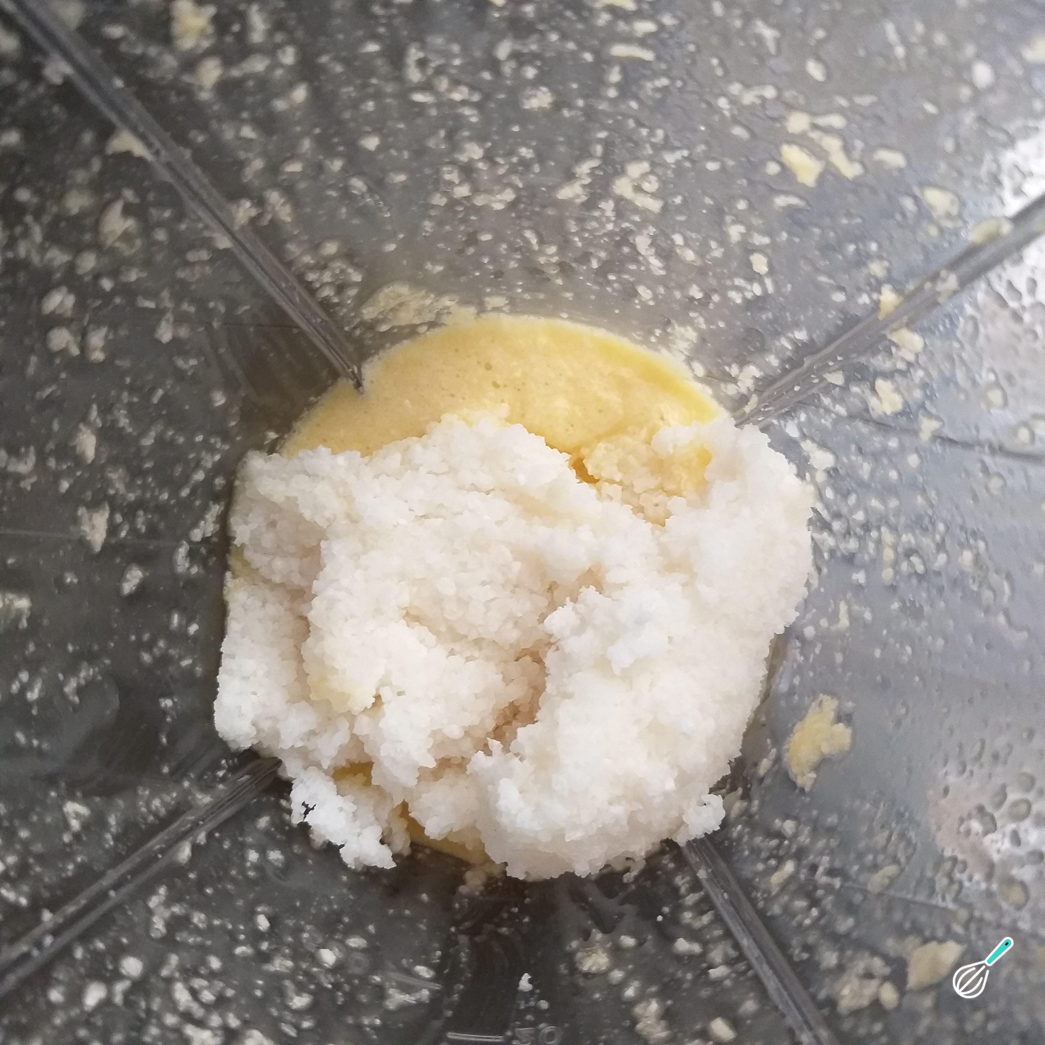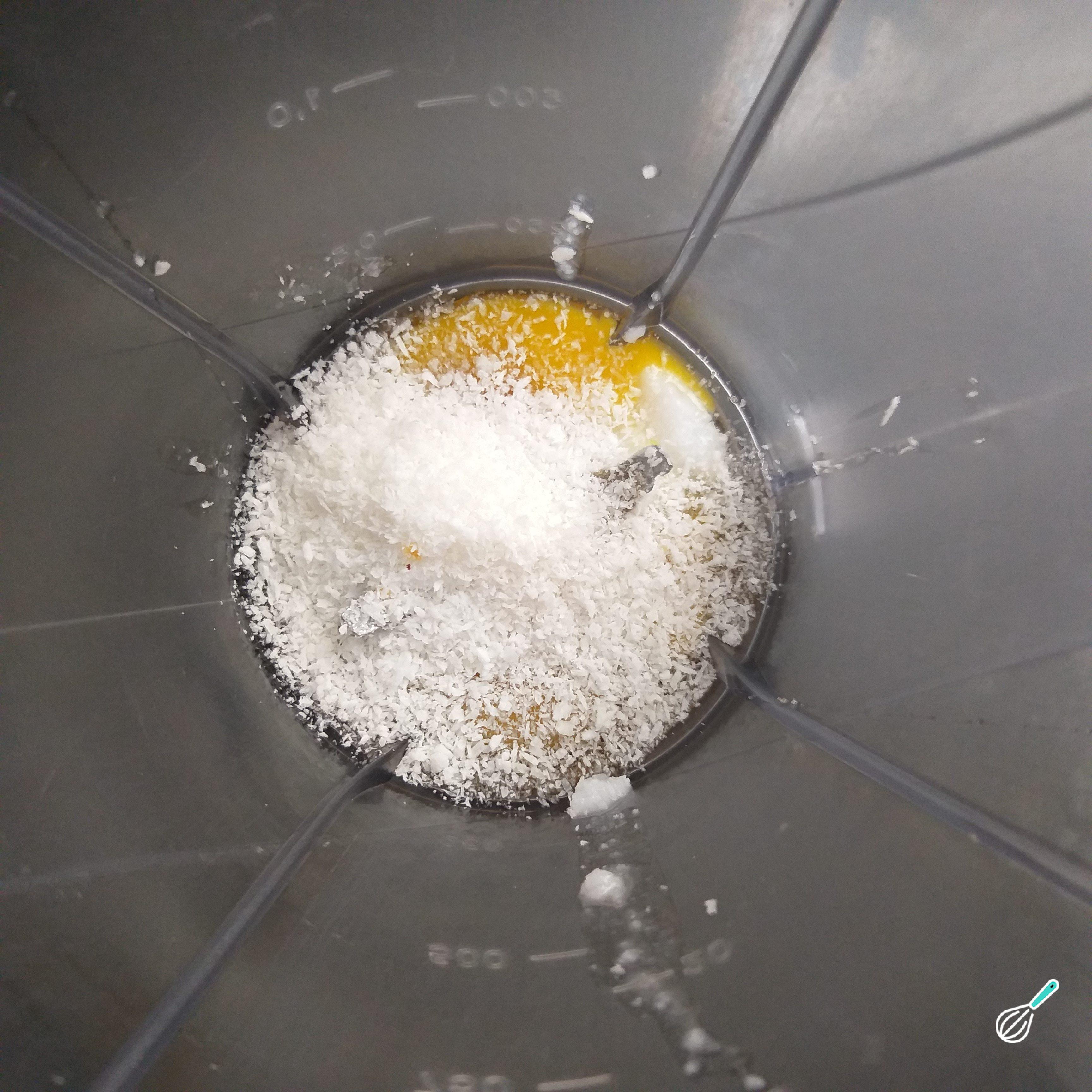 Bata no liquidificador os ovos, o açúcar, o coco ralado e o óleo de coco.