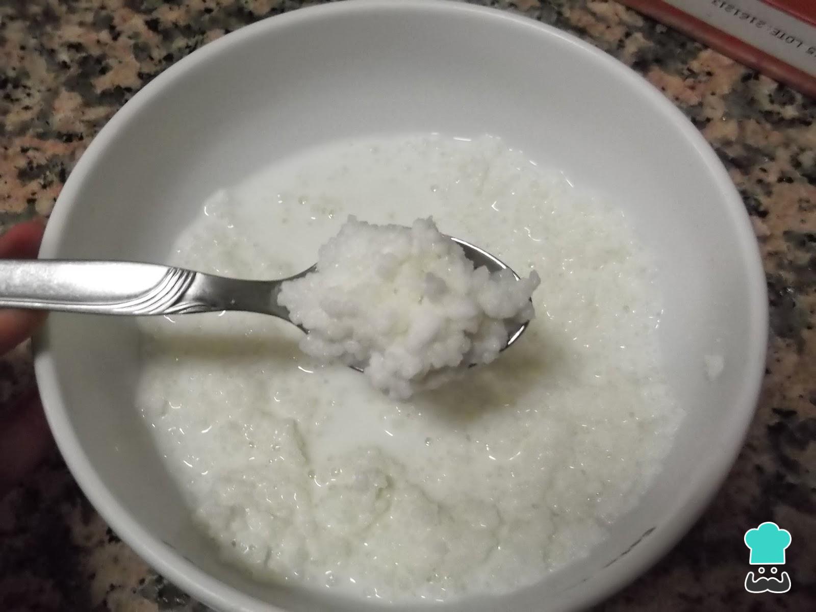 Para fazer este delicioso bolo de tapioca gelado comece por misturar a tapioca e o açúcar. Junte o leite quente pouco a pouco até a mistura ficar cremosa e deixe repousar por 10 minutos.