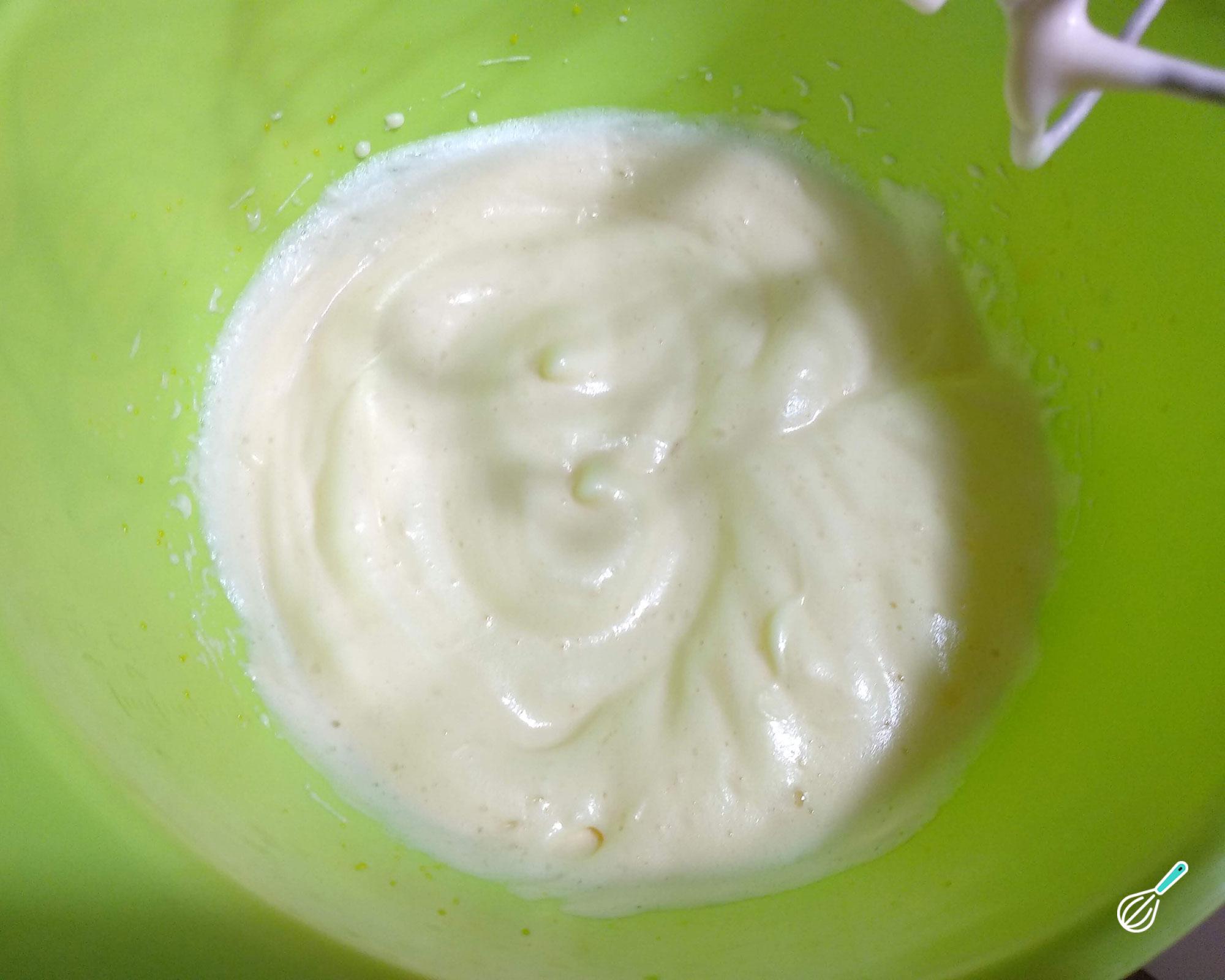 Depois do tempo indicado separe as gemas das claras e bata as claras na batedeira até ficarem firmes, em ponto neve. Enquanto bate adicione as gemas uma a uma, até obter um creme bem suave, como na foto.