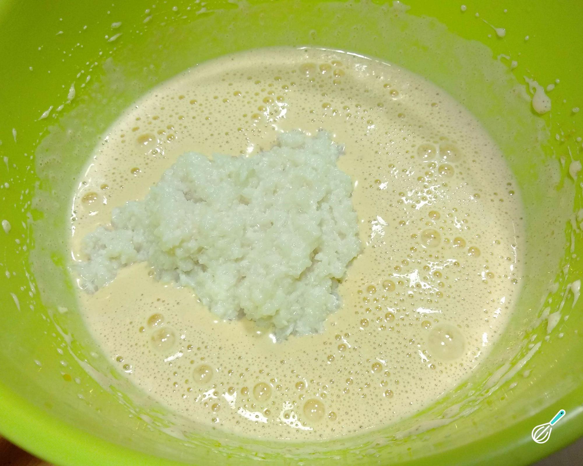 Em seguida adicione o açúcar pouco a pouco e, por fim, a margarina. Continue batendo por mais 1-2 minutos e desligue. Adicione o tapioca hidratada em duas etapas, misturando delicadamente para não perder o ar das claras batidas.
