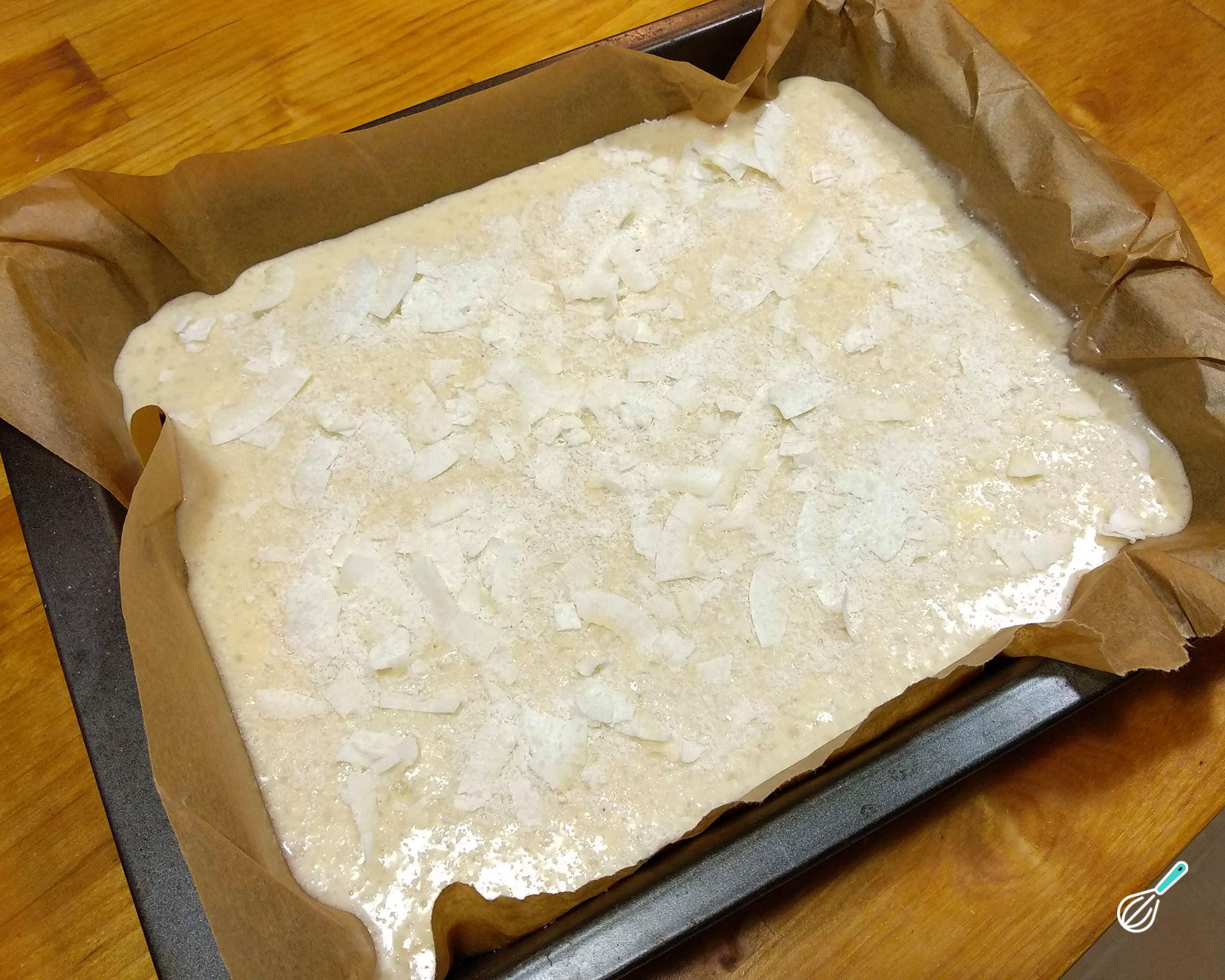 Despeje a massa em uma forma bem untada ou forrada com papel manteiga e, se quiser, polvilhe coco ralado ou em lascas. Coloque assando no forno preaquecido a 180°C por aproximadamente 40 minutos ou até o bolo ficar consistente e dourado.