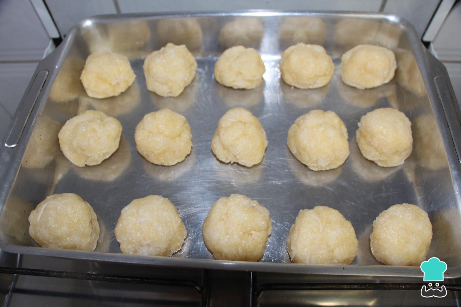 Quando a tapioca estiver branda, junte a manteiga, o coco ralado, os ovos, a erva doce e o queijo ralado. Amasse bem até integrar os ingredientes e obter uma massa consistente para modelar os bolinhos (do tamanho de pão de queijo).