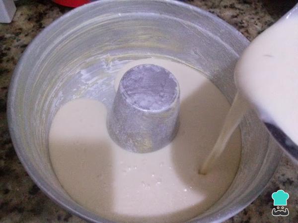 Adicione a farinha, a tapioca, o coco ralado, o fermento em pó e envolva bem. Unte com manteiga, polvilhe com farinha uma forma com buraco e verta a massa para a forma. Leve ao forno por 40 minutos ou até não sair massa no palito.