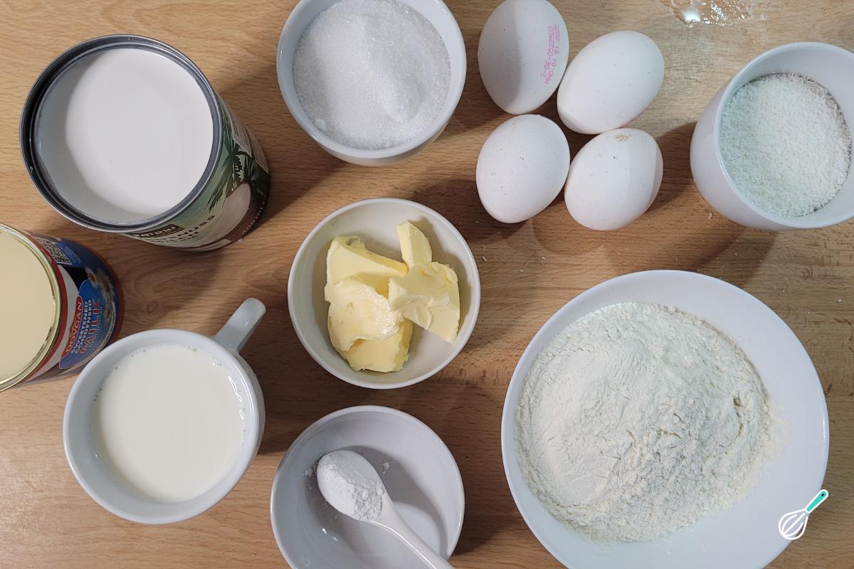 Enquanto o bolo está no forno, prepare a cobertura misturando o leite condensado, o leite e o leite de coco em uma tigela.