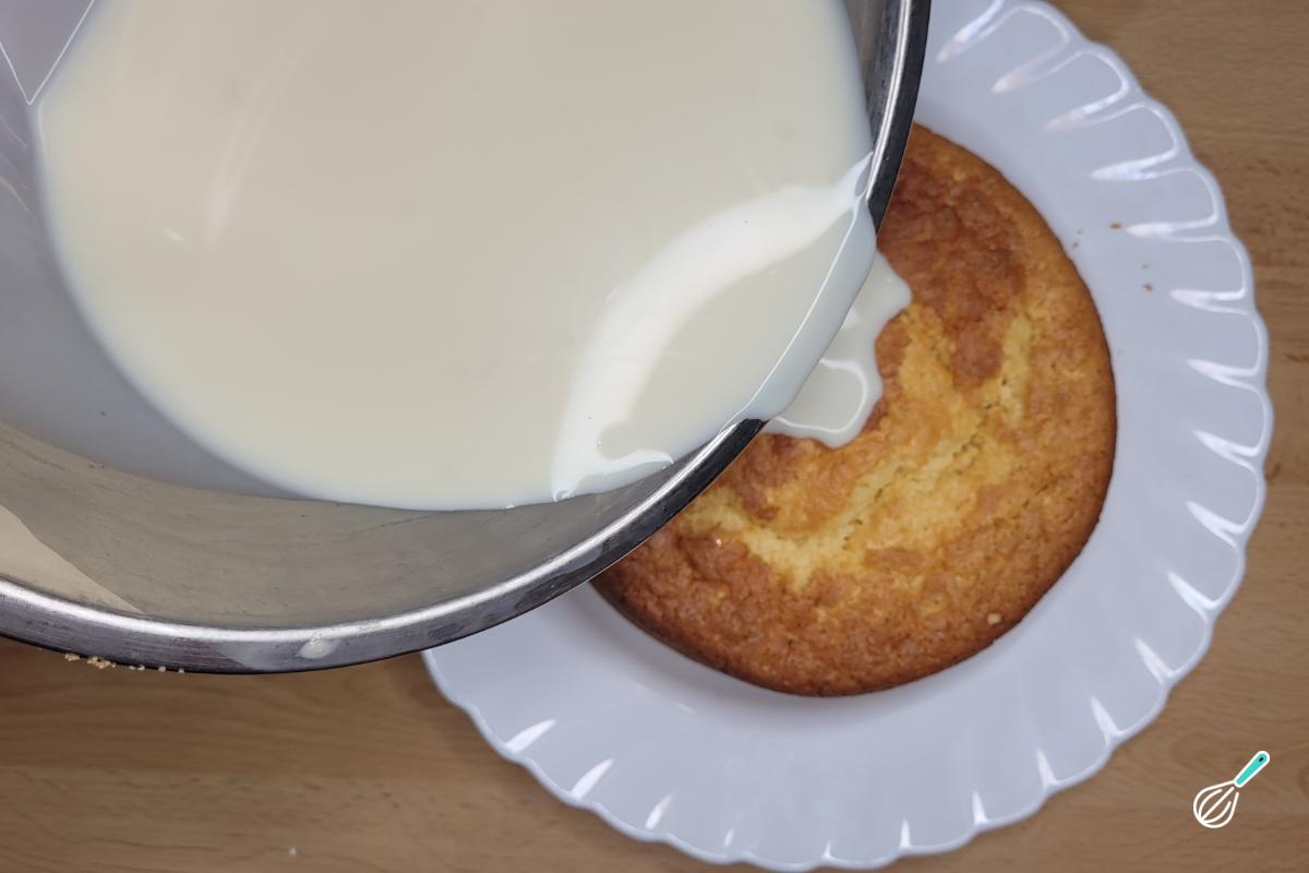 Quando o bolo sair do forno, espere esfriar um pouco, desenforme, faça furos na superfície com um garfo e despeje a calda com o bolo ainda quente, para que a calda penetre melhor no meio do bolo.
